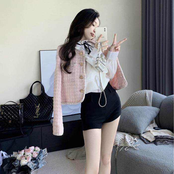 Blazer Pink Lengan Panjang Autumn Outer Crop Import Wanita Korea Atasan Tweed Atasan Wanita Casual Lengan Panjang Cardig