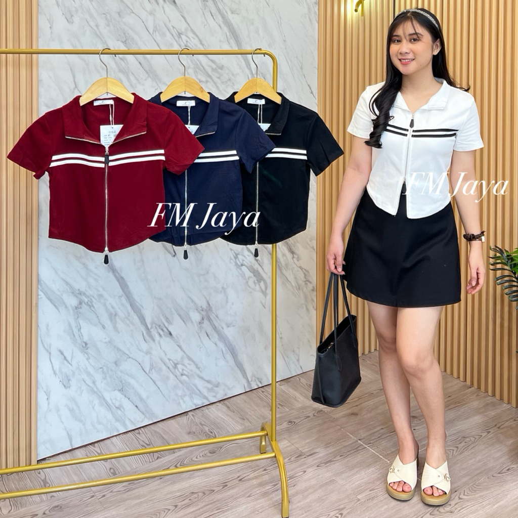 KAOS KERAH 2907 || KAOS WANITA LENGAN PENDEK || ATASAN CROP WANITA DOUBLE ZIPPER || ATASAN KERAH STYLE || KAOS WANITA CR