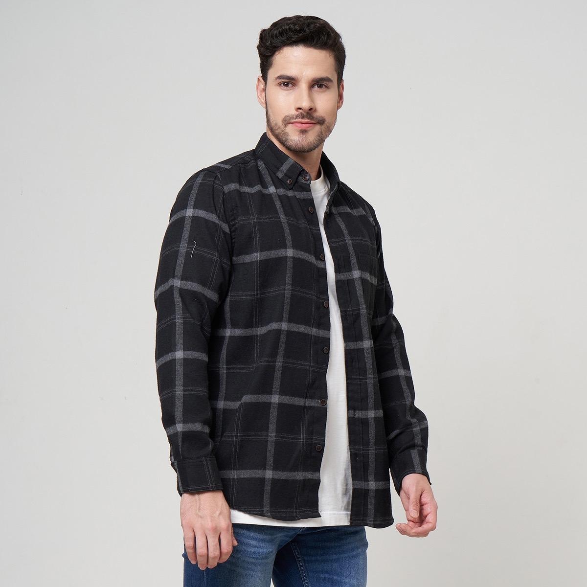 Kemeja Flanel PETER NATION Kerah High Basic Panjang Regular Fit Casual Hitam Distro Kotak Motif