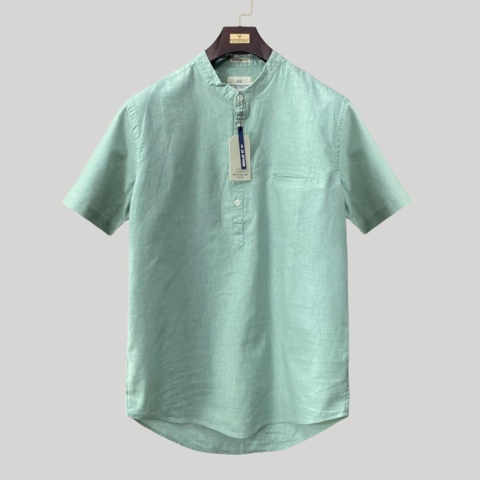 Peternation kemeja pria linen plus sanghai pendek wangki mint green