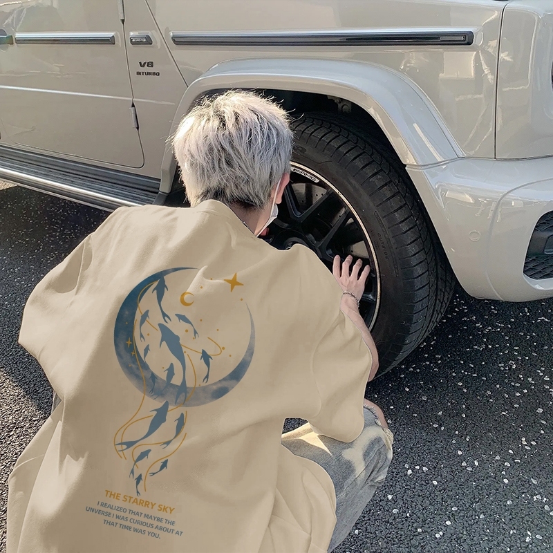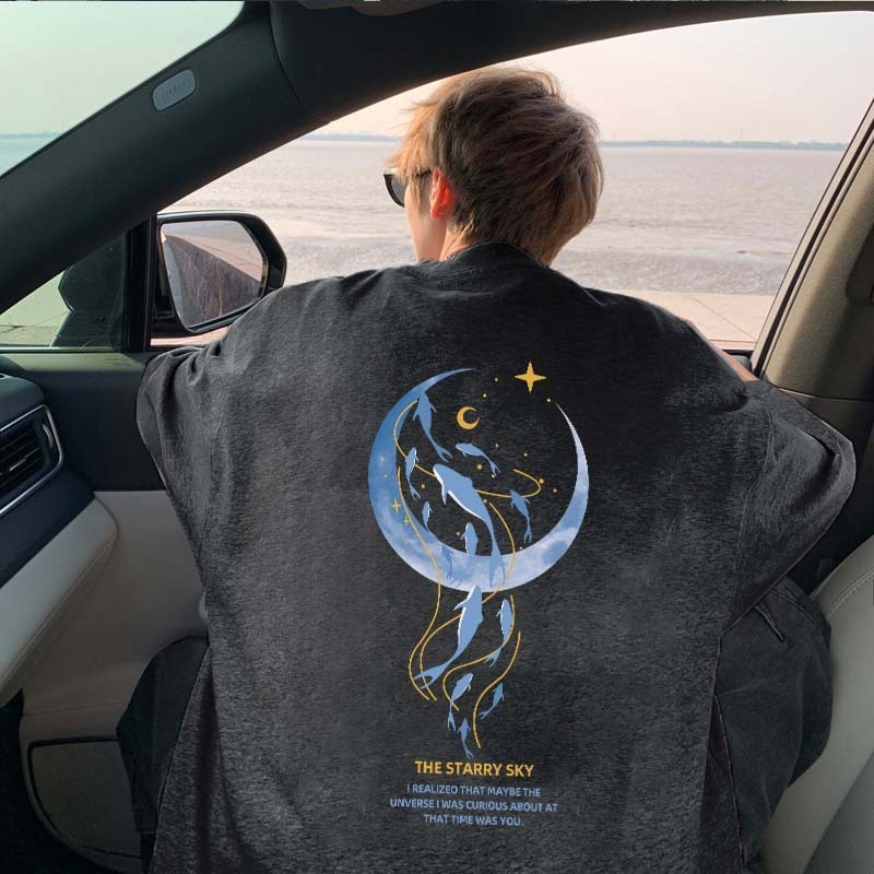 AUZY Kaos T-shirt Pria Oversize Cartoon Moon Dolphin Kaos Pria Distro Original 00 PERSEN Premium Longgar Street Style Kaos Putih/Baju Kaos Oversize Pria Keren/Kaos Pria The Starry Sky