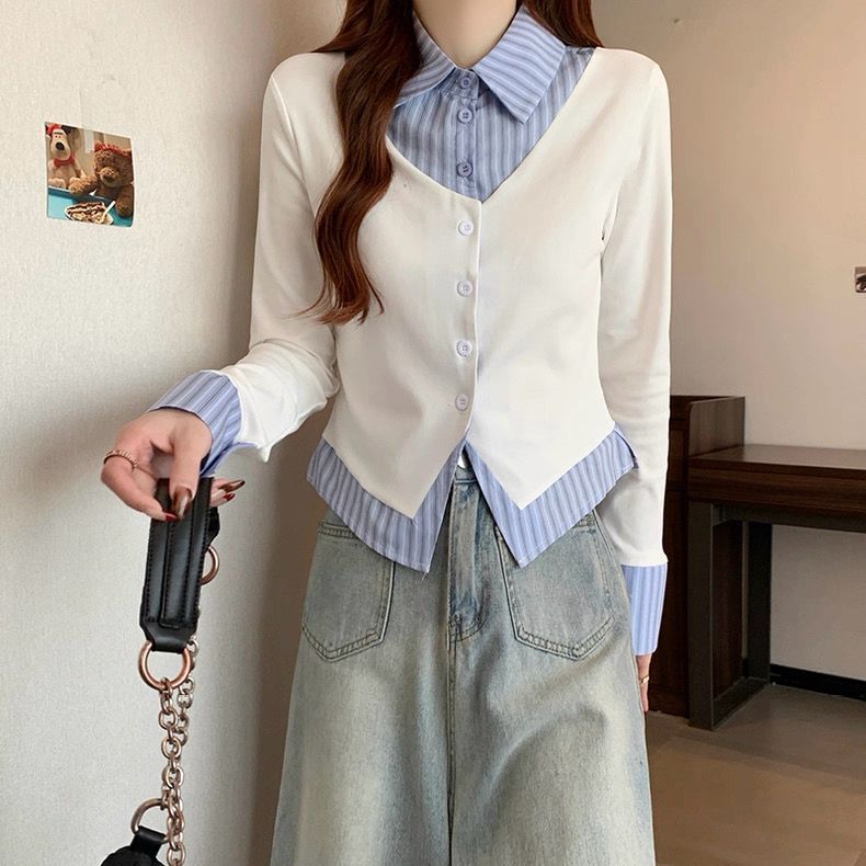 DEER FASHION - YUKI Top Kemeja Kombinasi Kantoran Kasual / Kemeja Garis Lengan Panjang Longsleeve Korean Style