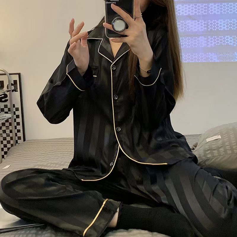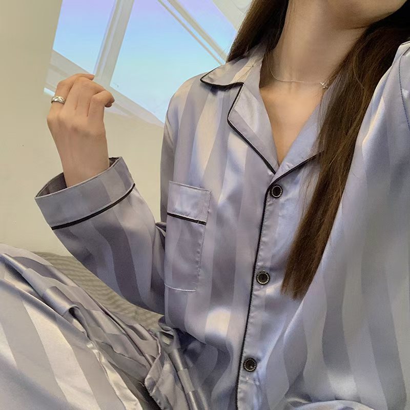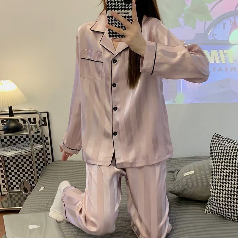 Piyama Wanita Motif Garis-Garis Satin Modis Kelas Atas Baru, Pakaian Rumah
