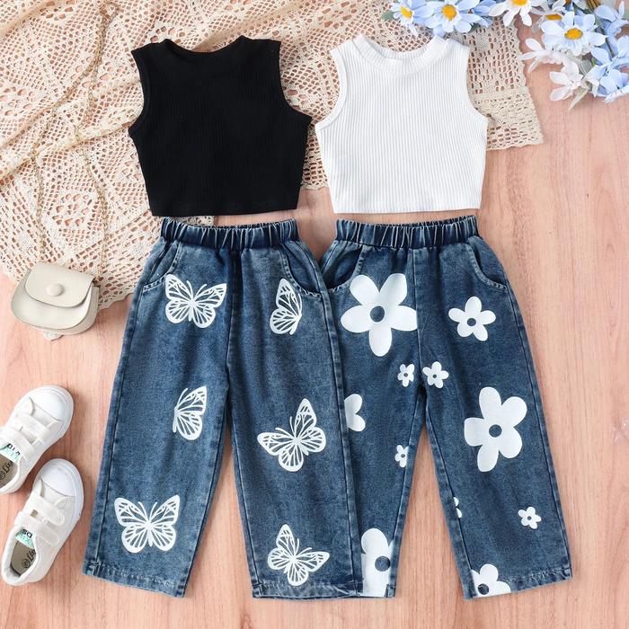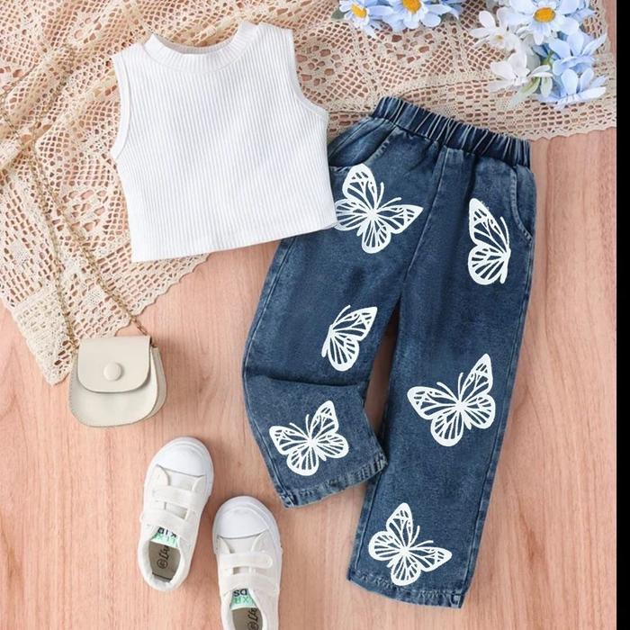 Terlaris SETELAN BAJU ANAK PEREMPUAN CELANA DENIM PANJANG MODEL CROP USIA 1-5 TAHUN - PUTIH 6-11 BULAN Keren