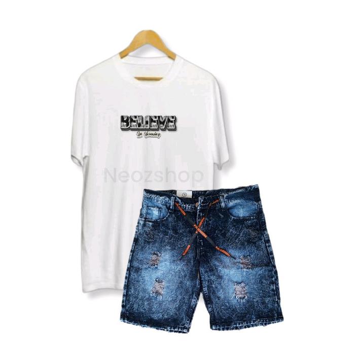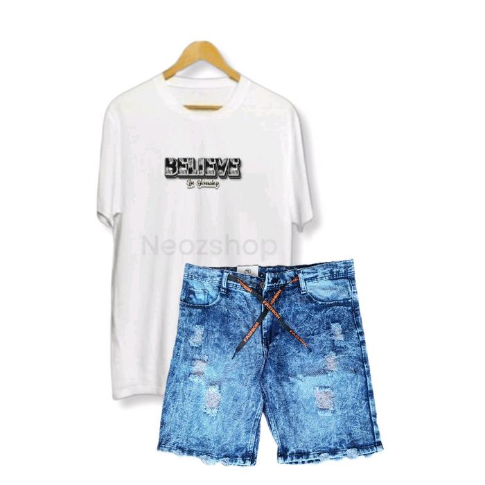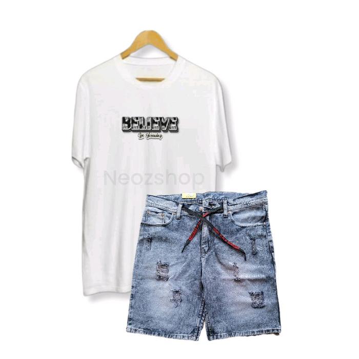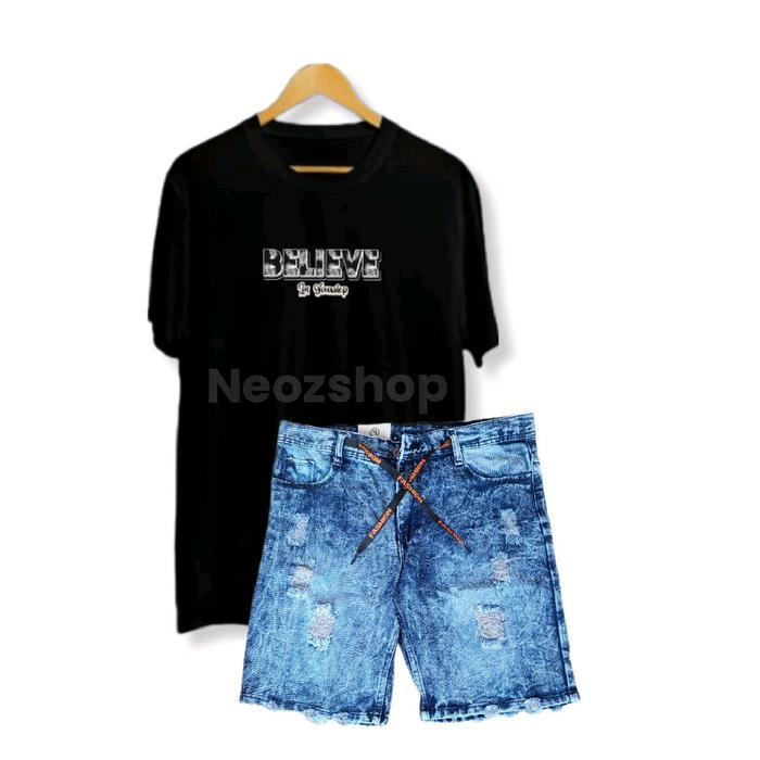 SETELAN KAOS BELIEVE DISTRO DAN CELANA JEANS PENDEK SOBEK PRIA DEWASA KEREN - KAOS HITAM,SNOW HITAM, 28