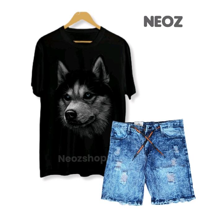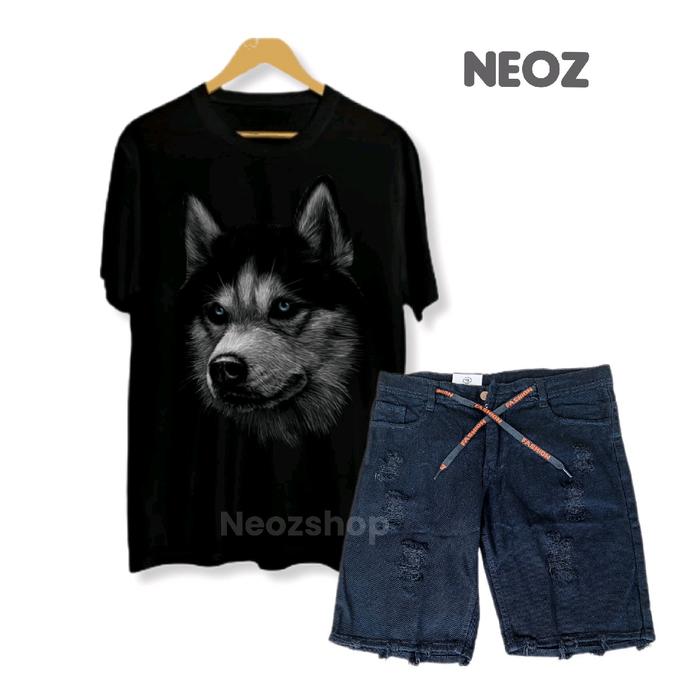 SETELAN KAOS DISTRO MOTIF SERIGALA DAN CELANA PENDEK JEANS SOBEK PRIA DEWASA - HITAM - KATUN - SERIGALA X BLACK, 28L