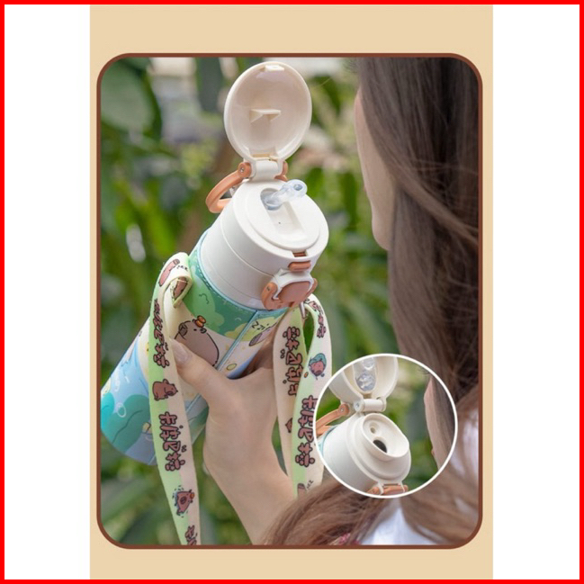 Tumbler Stainless Steel 316 Capybara Tahan Panas Dingin 520ml Cute Aesthetic Selempang Botol Minum