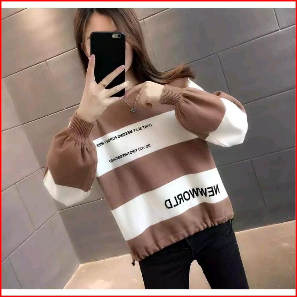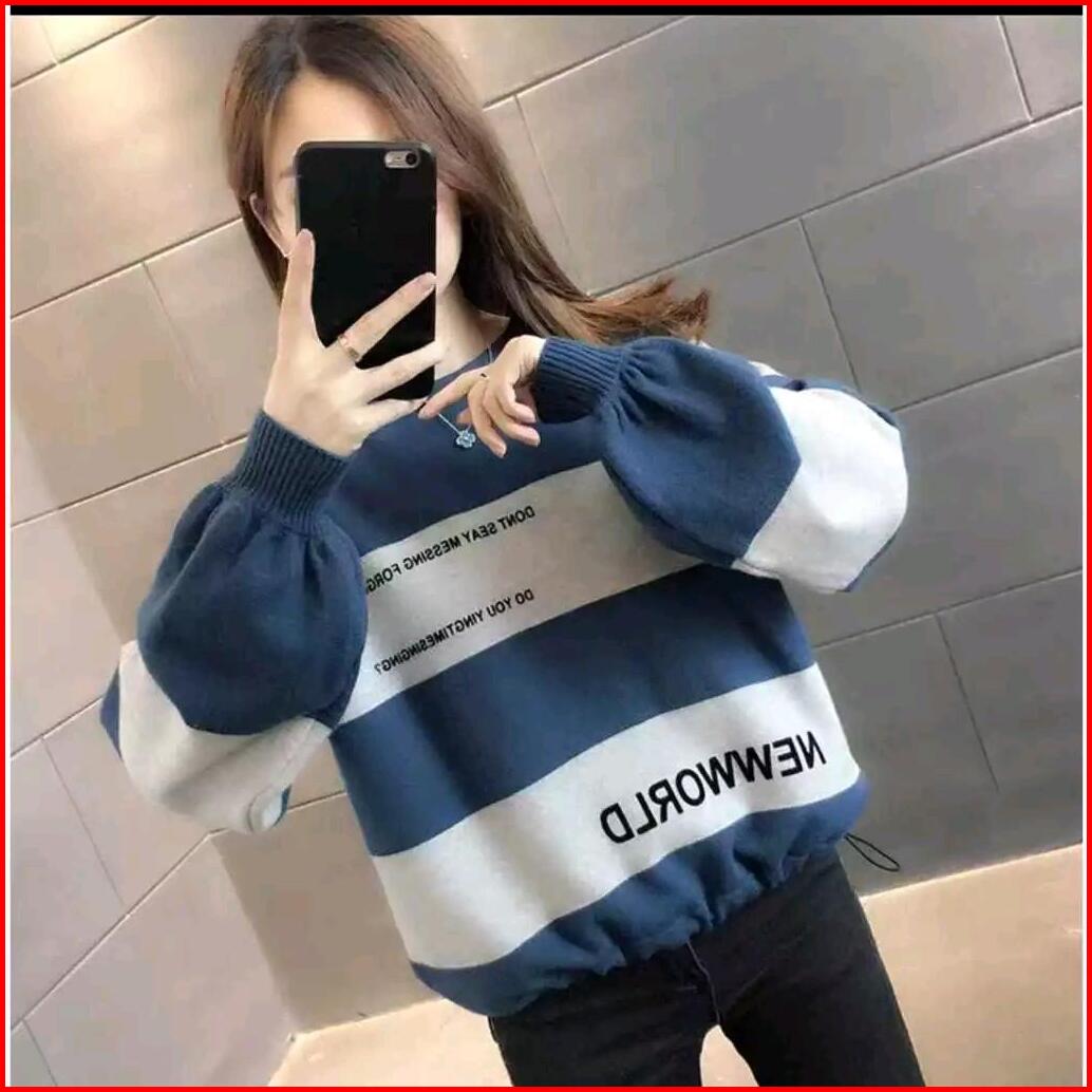 Sweater Wanita Crewneck Crop Strips New World Baju Cewek Bahan Fleece Tebal Gramasi 280gr