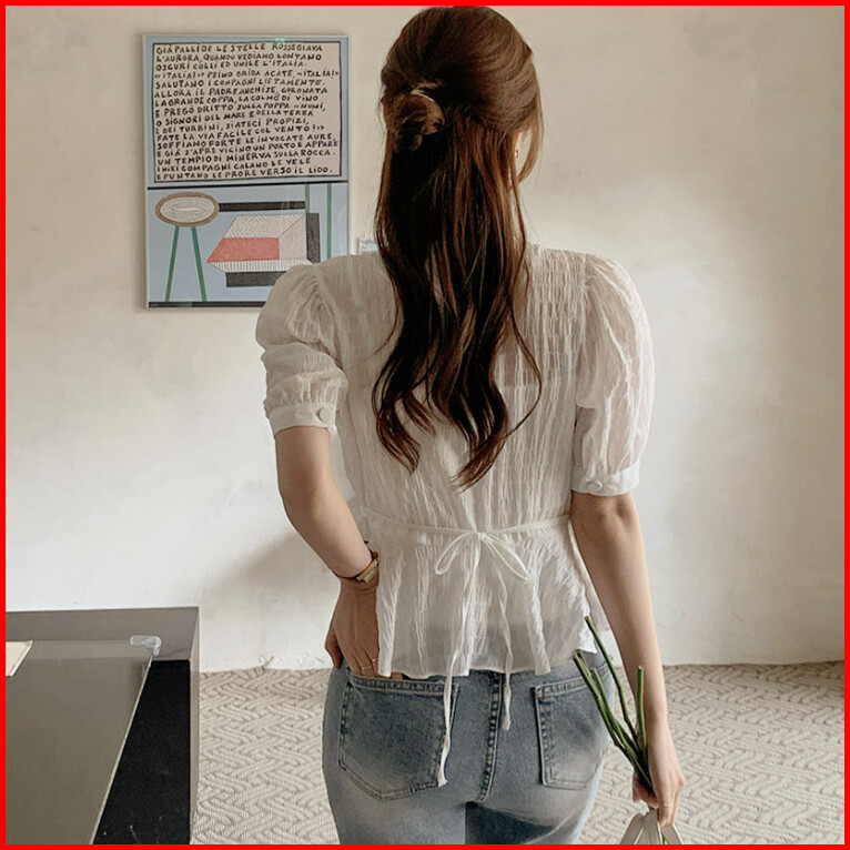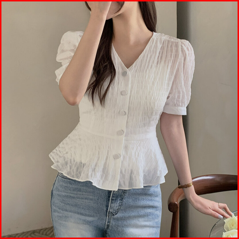 Atasan Kemeja Lengan Pendek Gaya Korea Dengan Leher V Dan Pinggang Pas Untuk Wanita