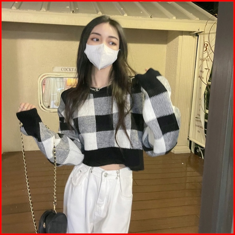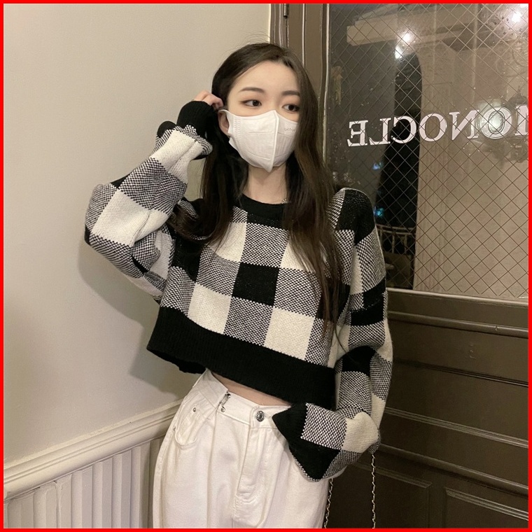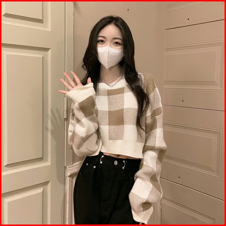Versi Korea Sweter Leher Bulat Pendek Kotak-kotak Retro Longgar Atasan Lengan Panjang Wanita
