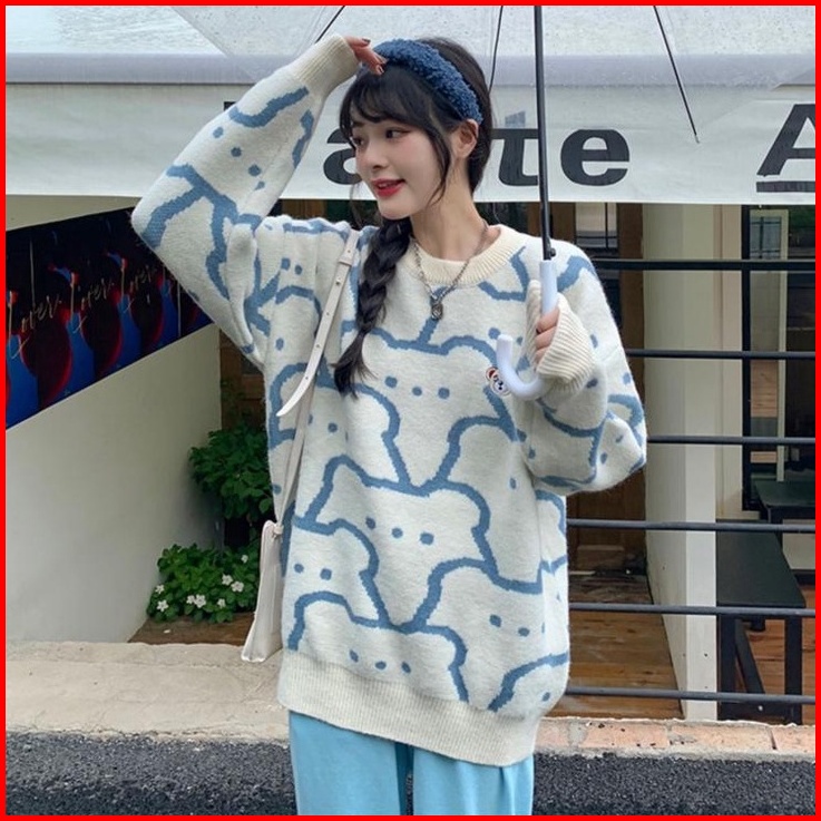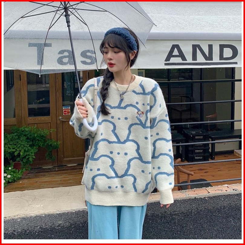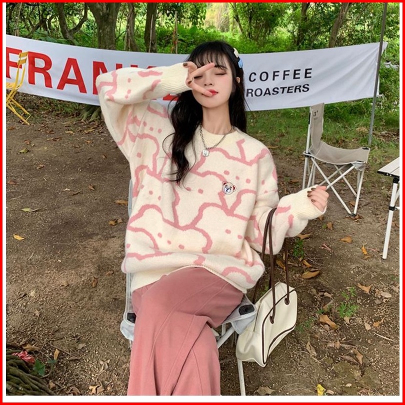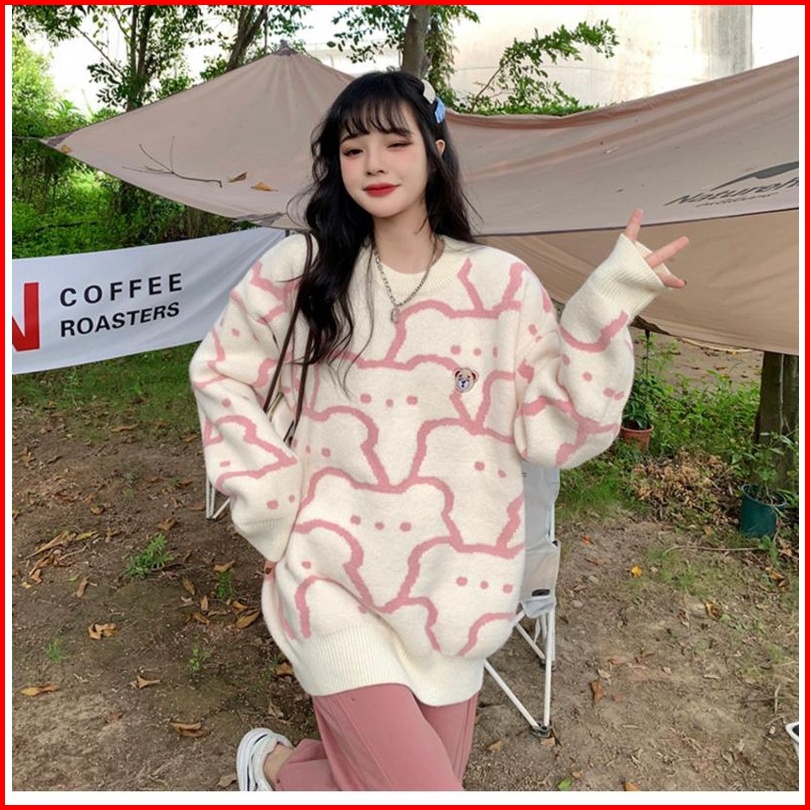 Sweater Pullover Leher Bulat Beruang Lucu Untuk Wanita Sweater Rajutan Jepang Atasan Lengan Panjang