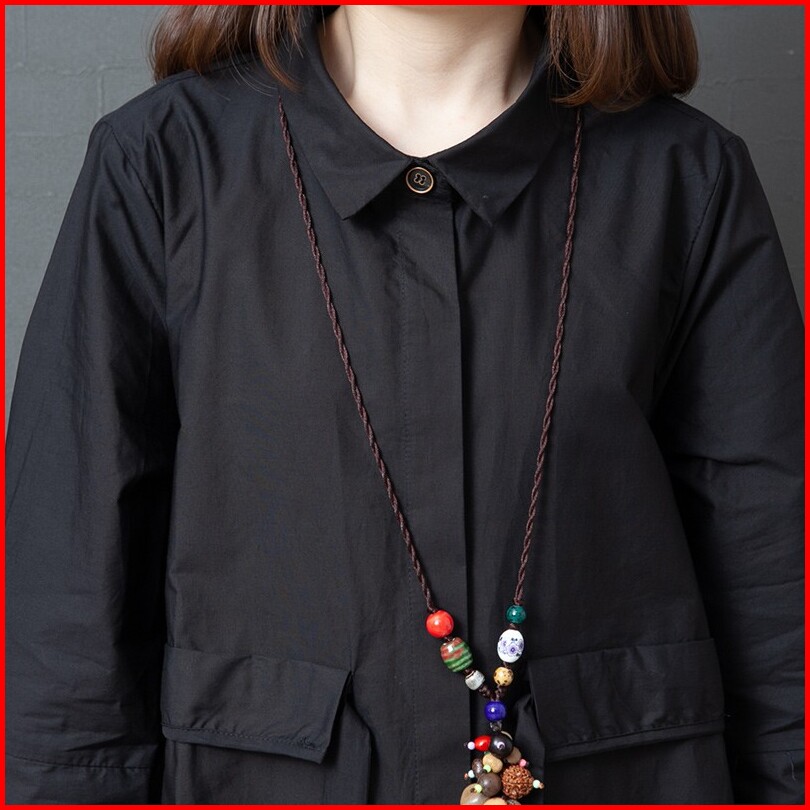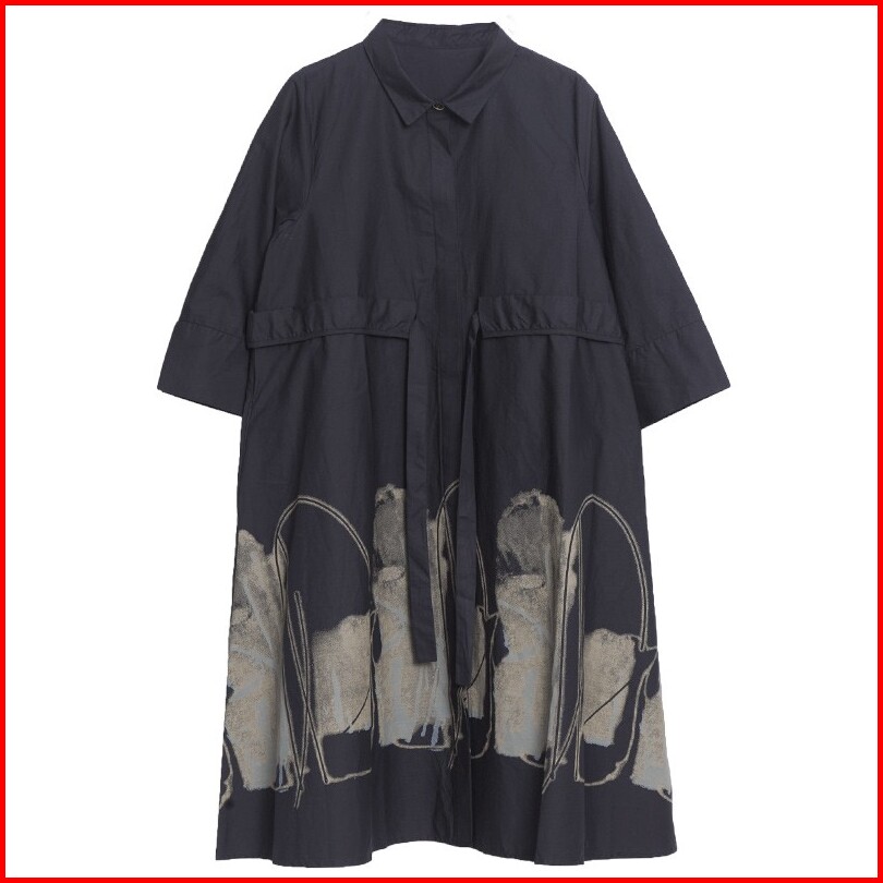 Wanita Mode Musim Gugur Lengan Panjang Kebesaran Dicetak Gaun Kemeja Midi Hitam