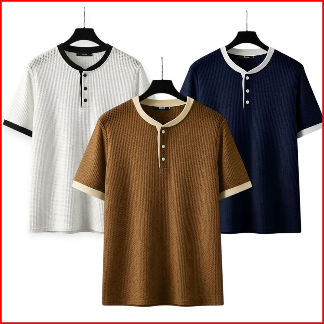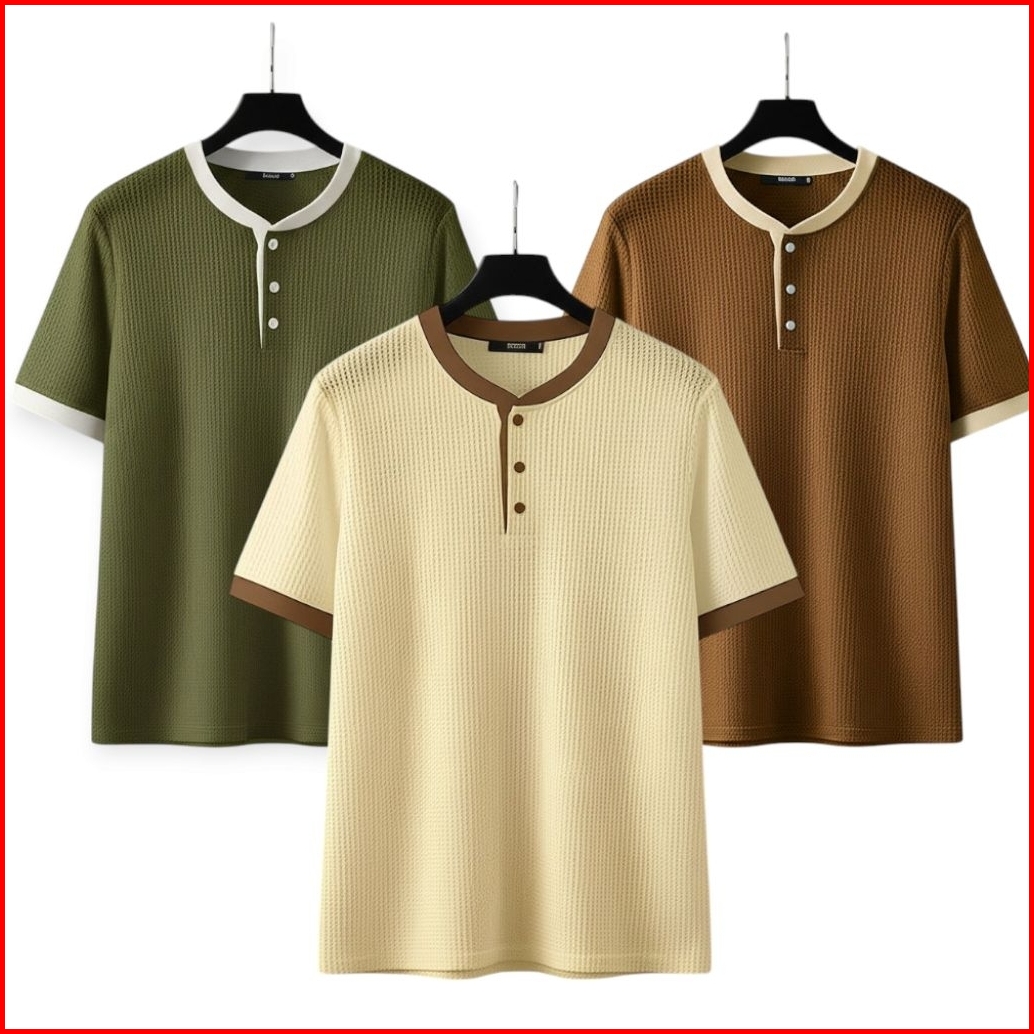Paket Hemat 3 Pcs Kaos Hanley Sanghai List Bahan Waffle Kaos Kancing Bahan Waffle Knit Kombinasi