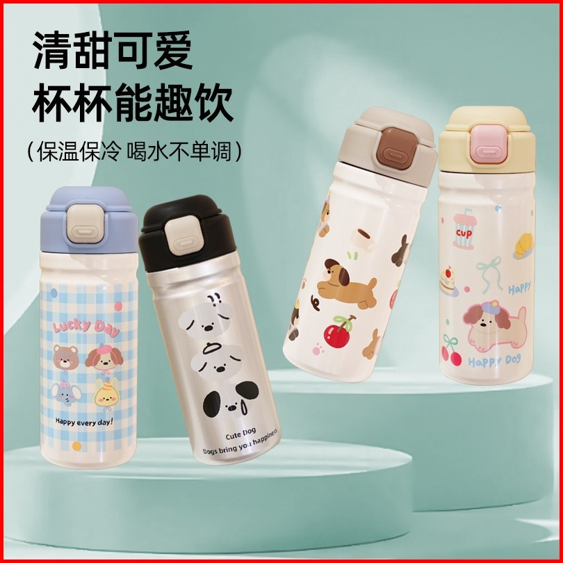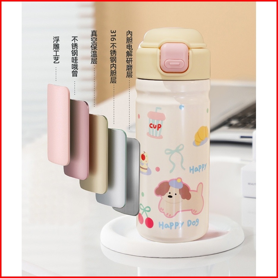 Premium Tumbler Termos Botol Minum Sedotan 450 Ml Motif Dog Dengan Sedotan Dan Tali Portable Vacuum Cup Insulated Bottle