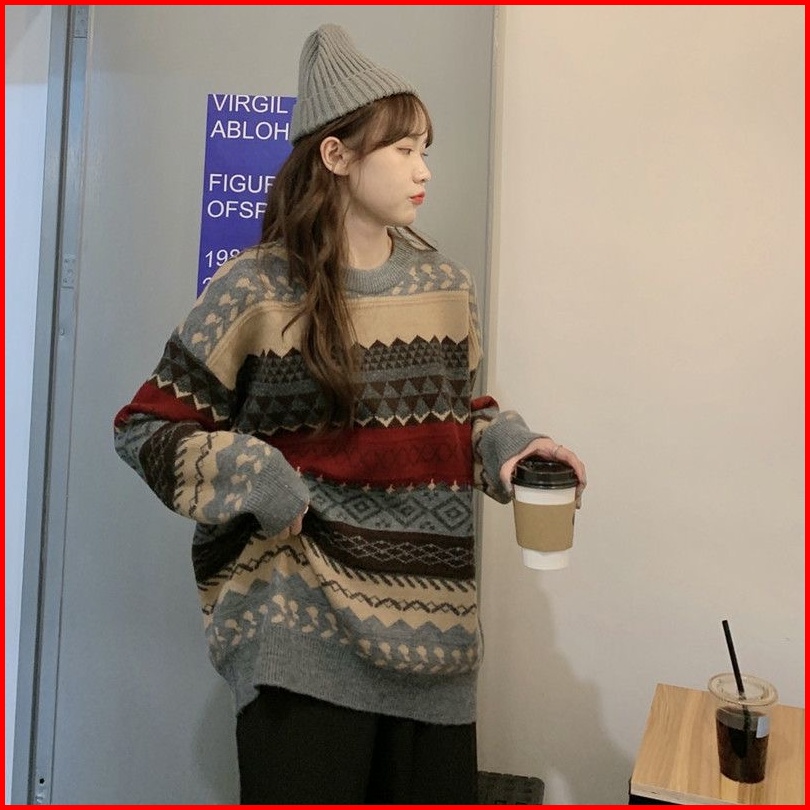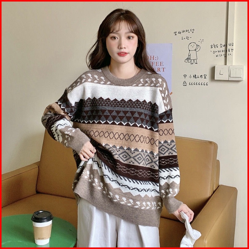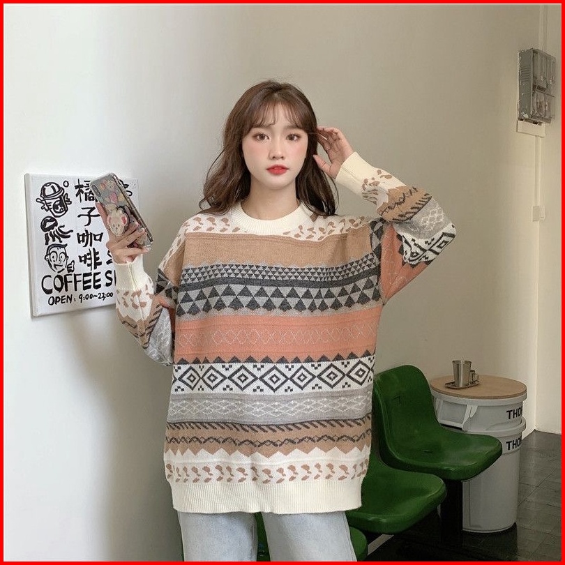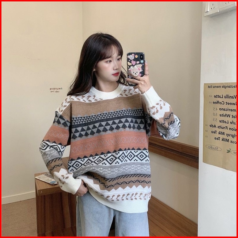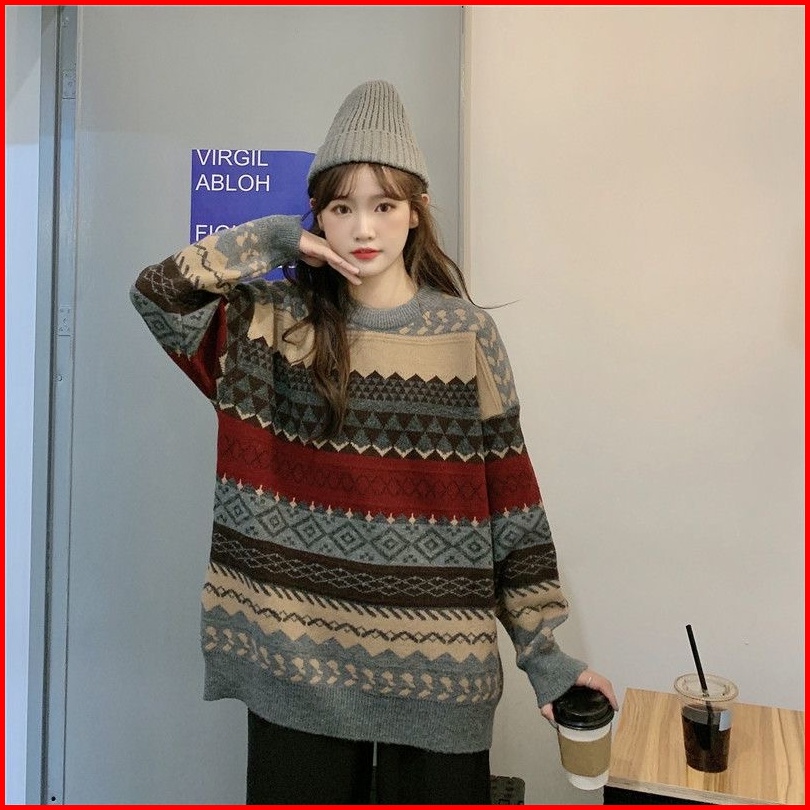 Sweater Kerah Kru Wanita Vintage Longgar Kasual Lengan Panjang Atasan Rajut