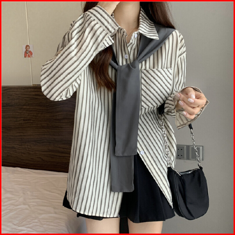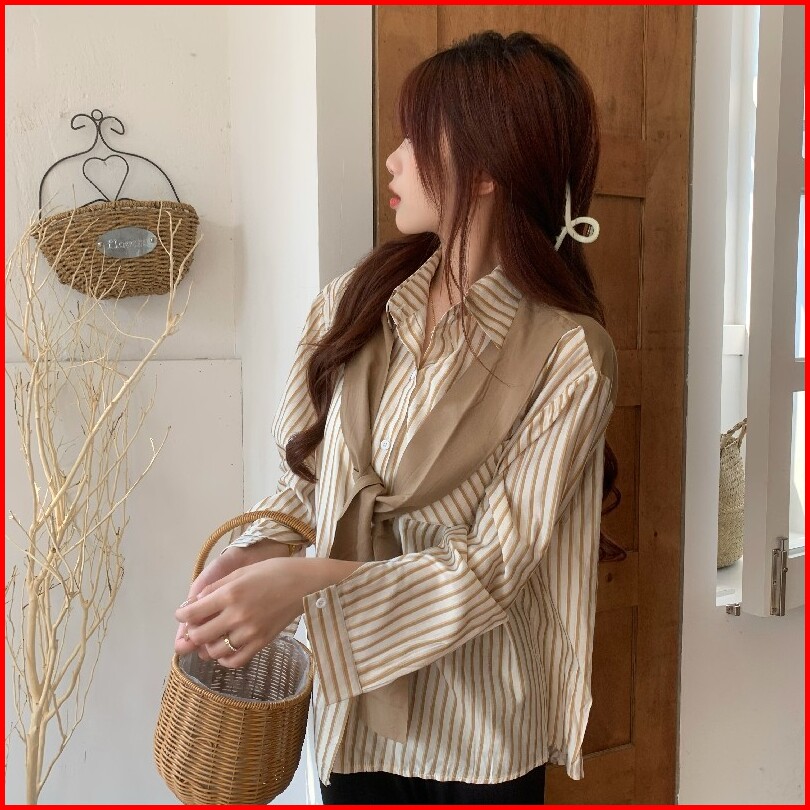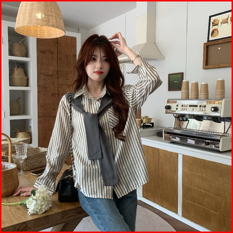 Kemeja Wanita Lengan Panjang Model Korea Desain Fashionable Dengan Kerah Selendang Dan Motif Garis Longgar Dan Stylish