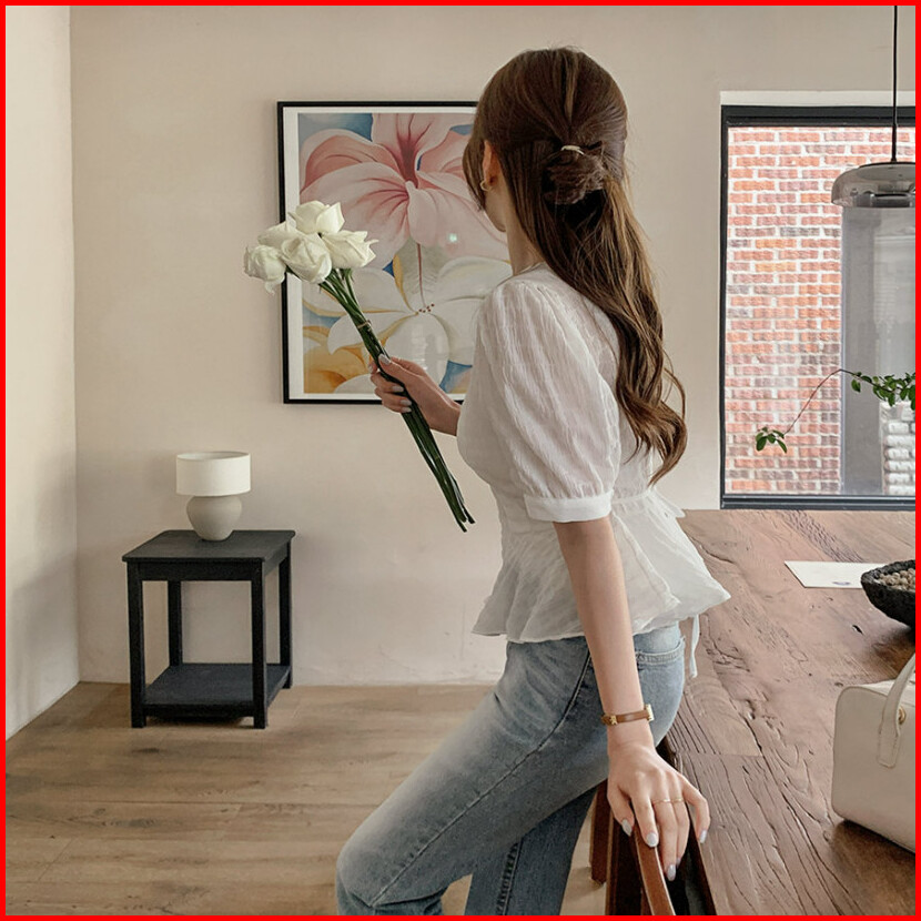 Kemeja Putih Lengan Pendek Blouse Wanita Ruffle Slim Fit V-neck Elegan Korea Lengan Puff Casual