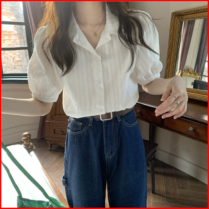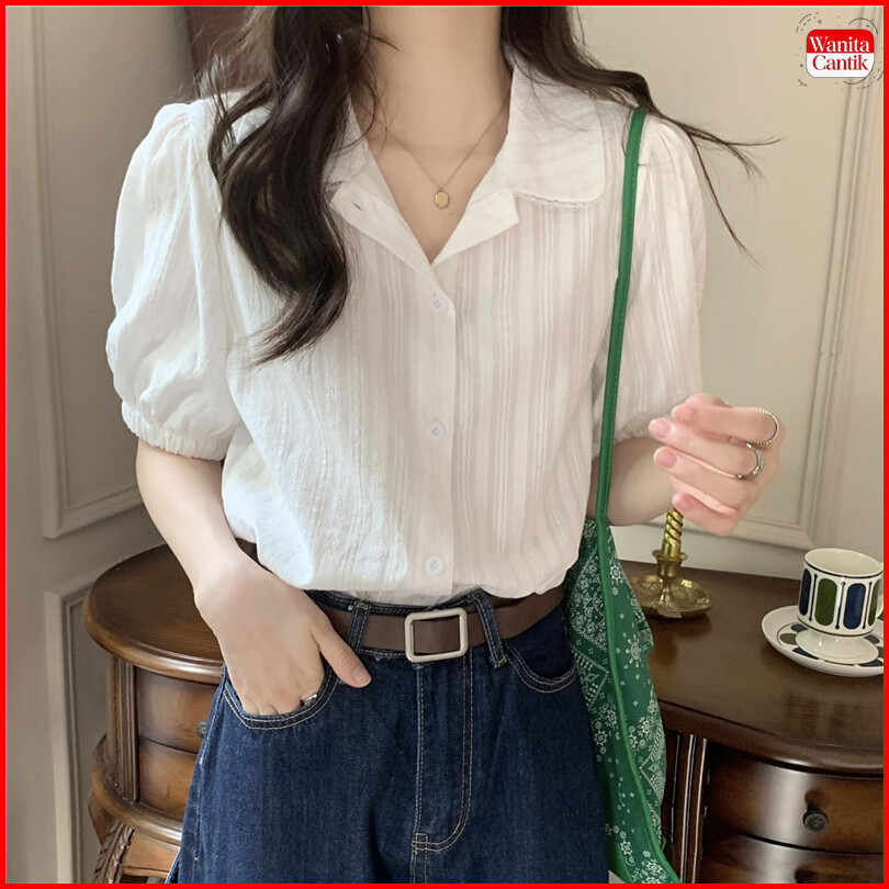 Blouse Wanita Korea Vintage Elegan Kemeja Katun Putih Lengan Pendek Kerah Boneka Renda Blus