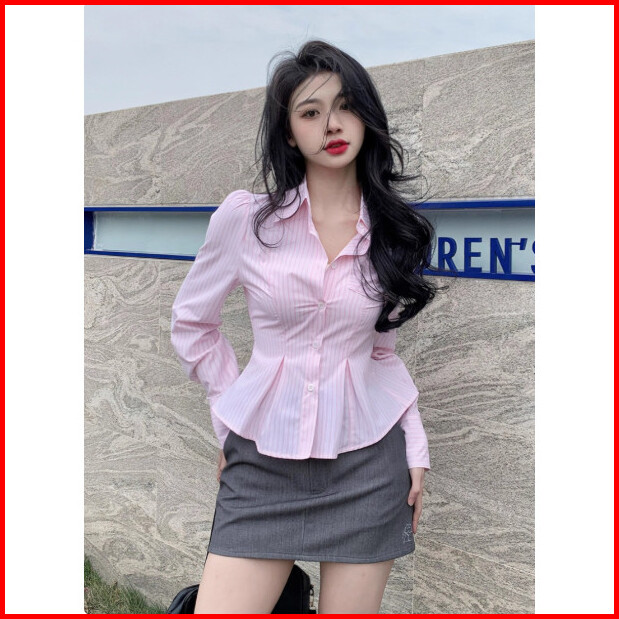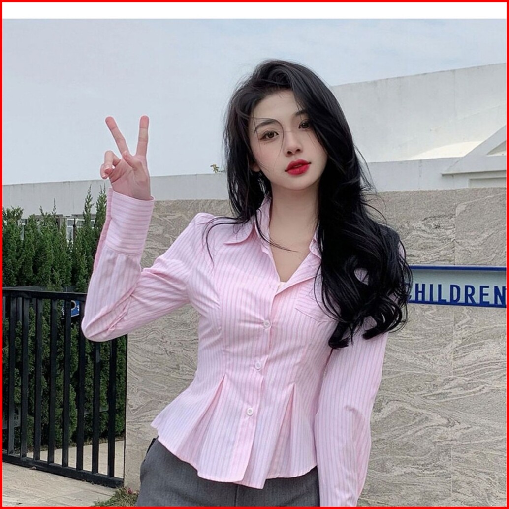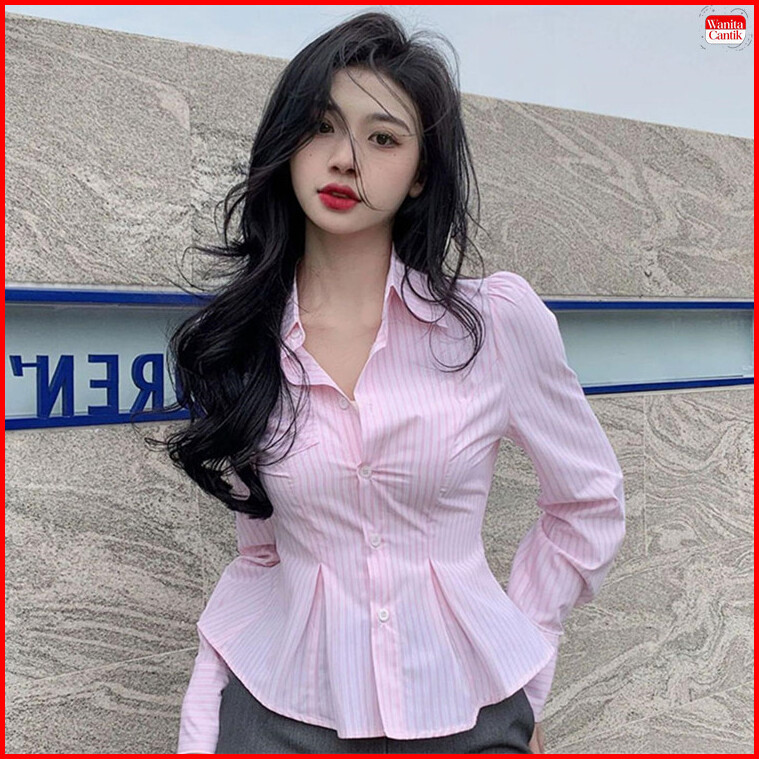 Kemeja Wanita Korea Elegan Lengan Panjang Garis Slim Fit Sexy Fashion Casual Blouse Terbaru