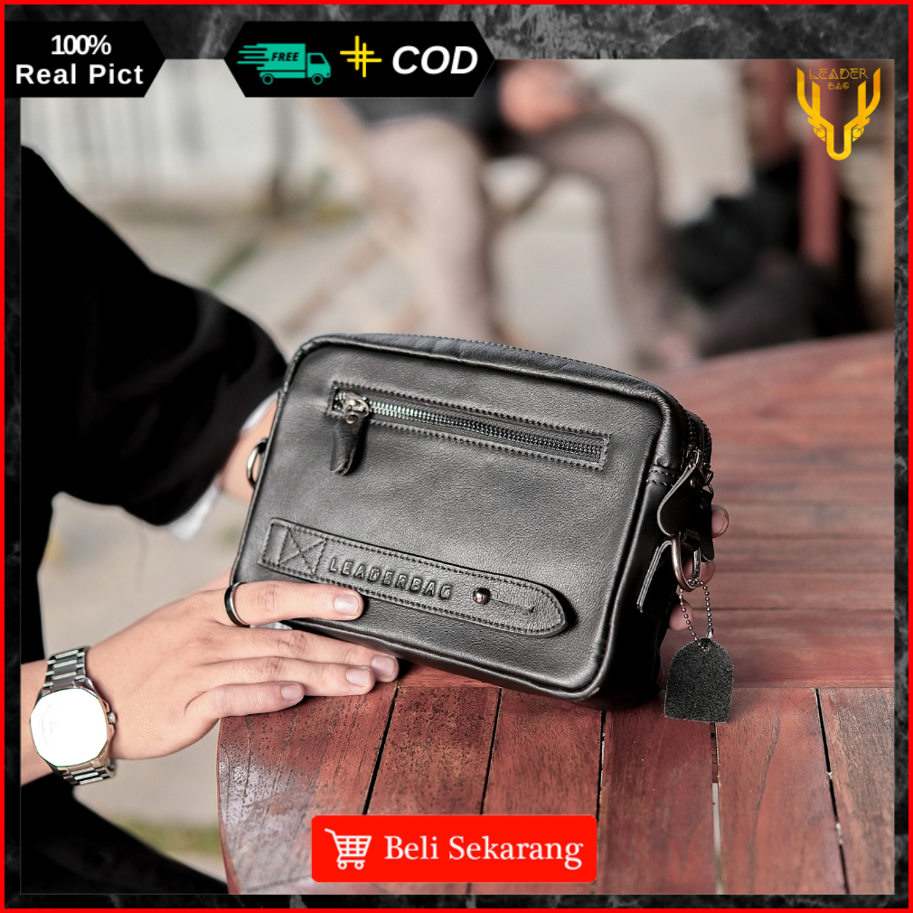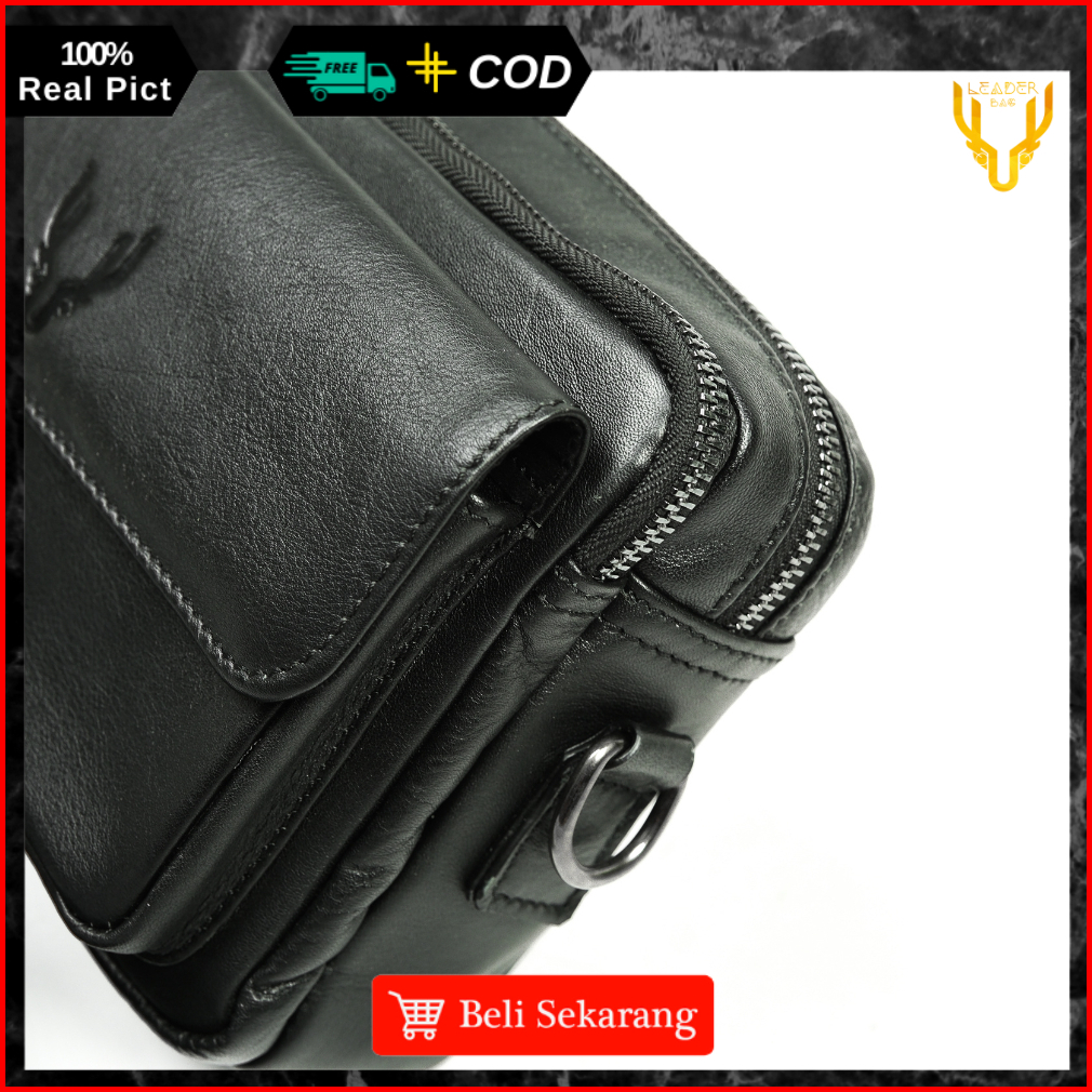 Tas Selempang Pria Kulit Sapi Asli Leaderbag Hitam Waterproof Handbag 2in1 Keren Premium Multifungsi