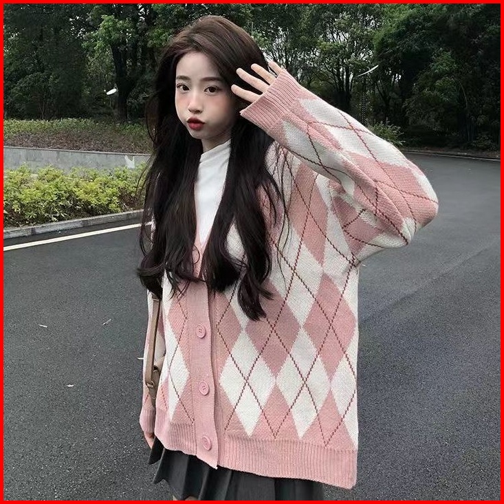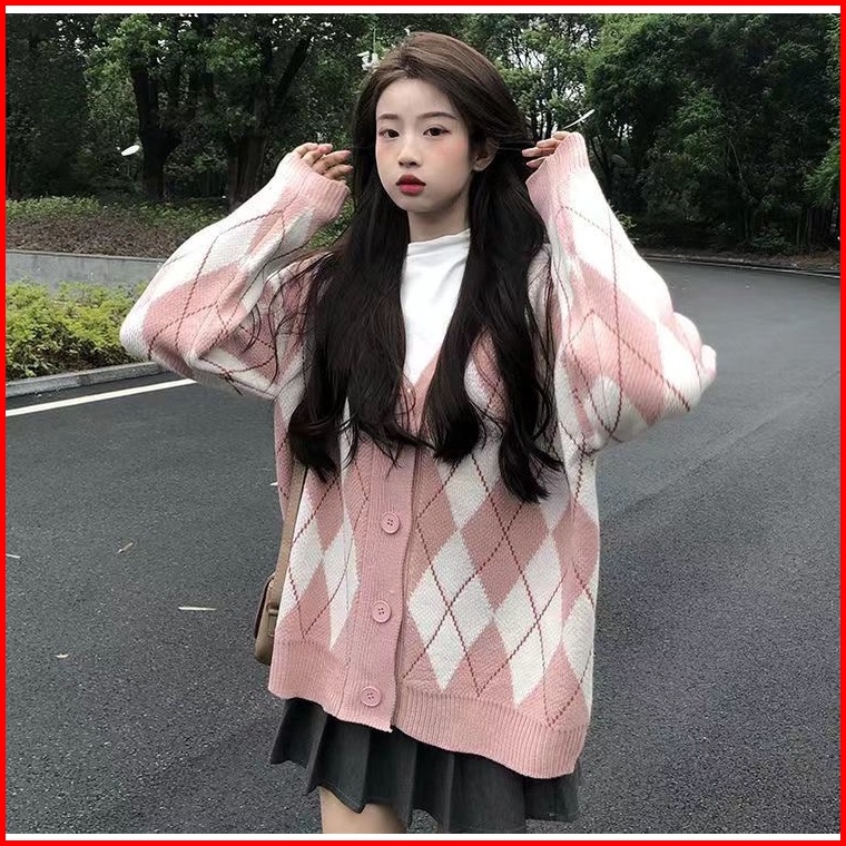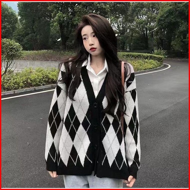 Sweater Kardigan Wanita Jaket Kardigan Lengan Panjang Kotak-kotak Retro Korea