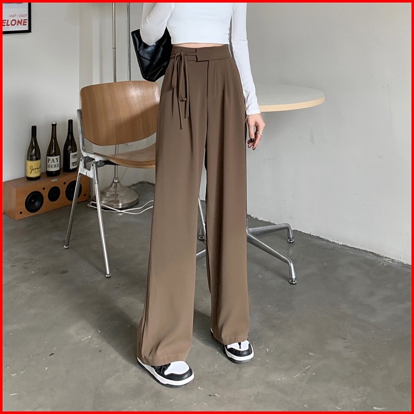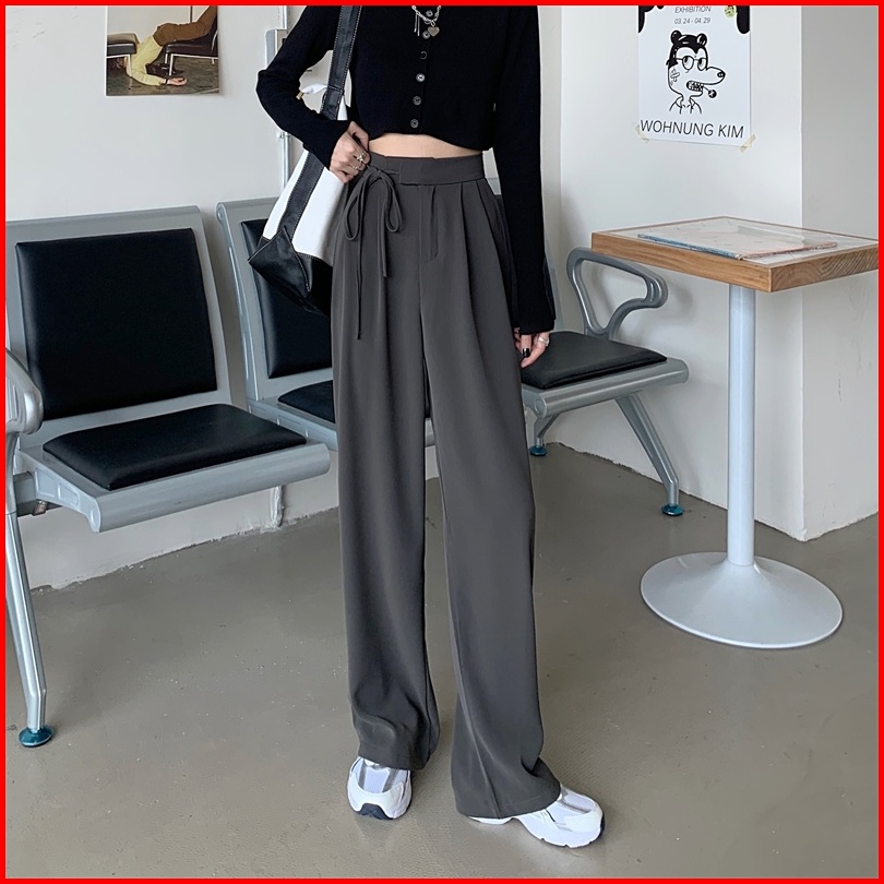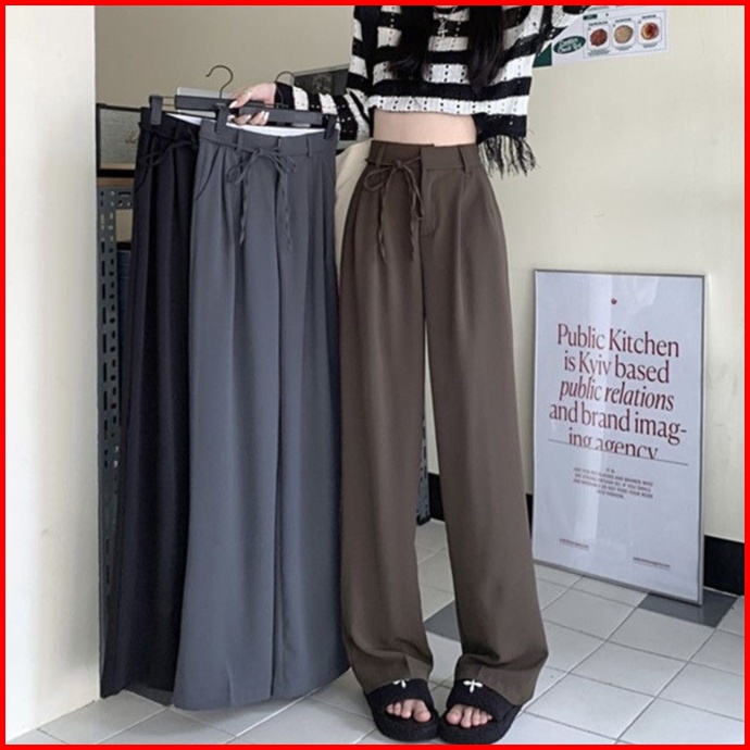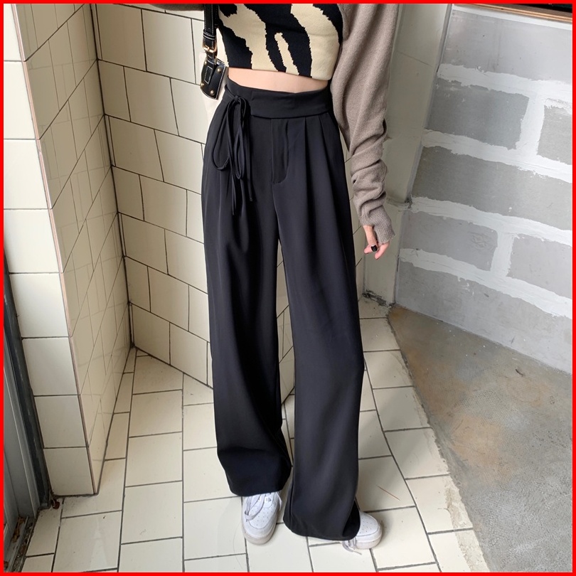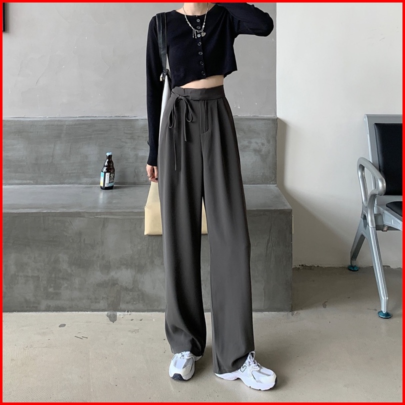 Fashion Kasual Celana Kaki Lebar Wanita Gaya Korea Bertali Celana Lurus Pinggang Tinggi