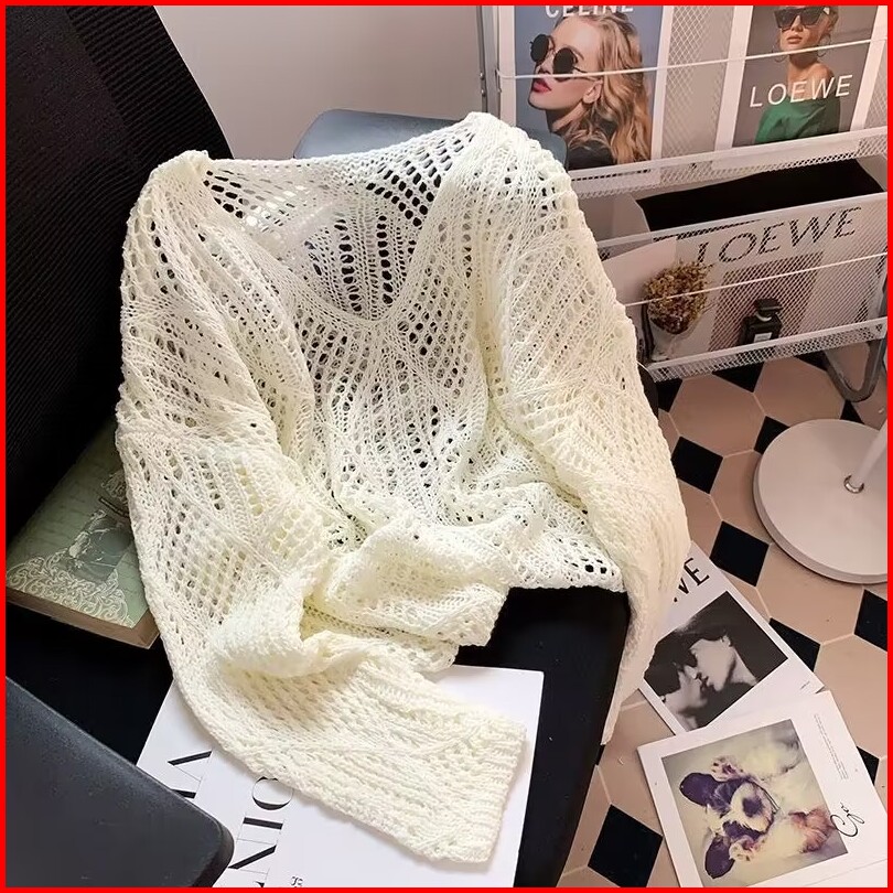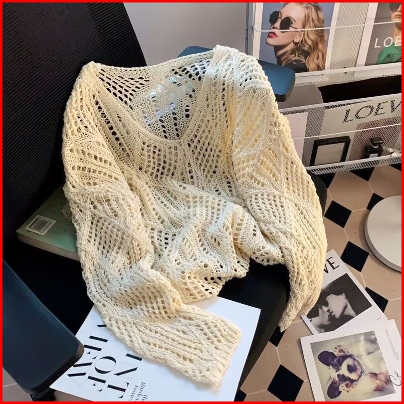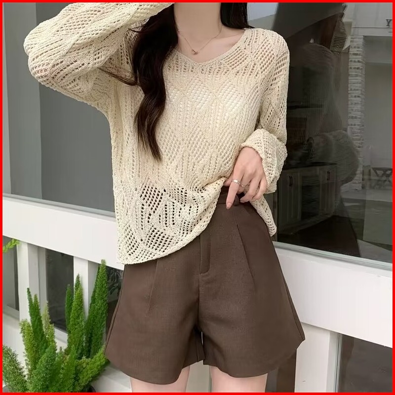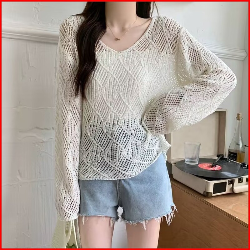 Sweter Berongga Gaya Korea Wanita Atasan Sweter Lengan Panjang Longgar Kerah V Untuk Wanita