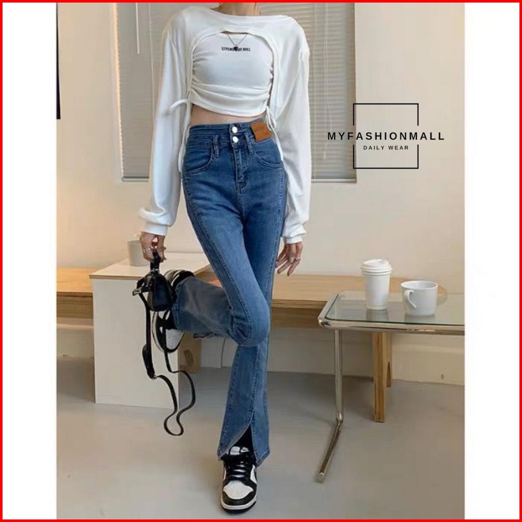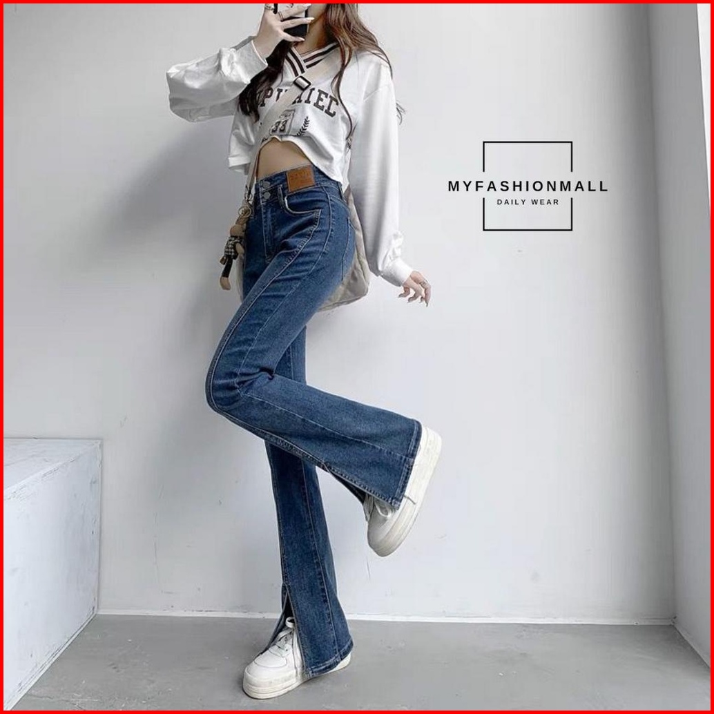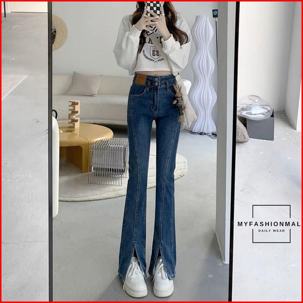 Mfm Celana Cutbray Wanita Jeans Highwaist Melar 8014 Stretch 2 Kancing Celana Retro Kaki Belah Casual Slim-fitting