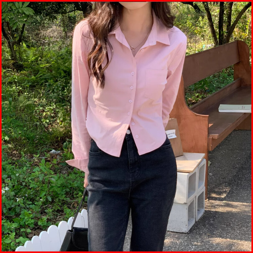 Kemeja Polos Wanita Lengan Panjang Crop Top Korea Casual Elegan Slim Fit Fashion Blouse