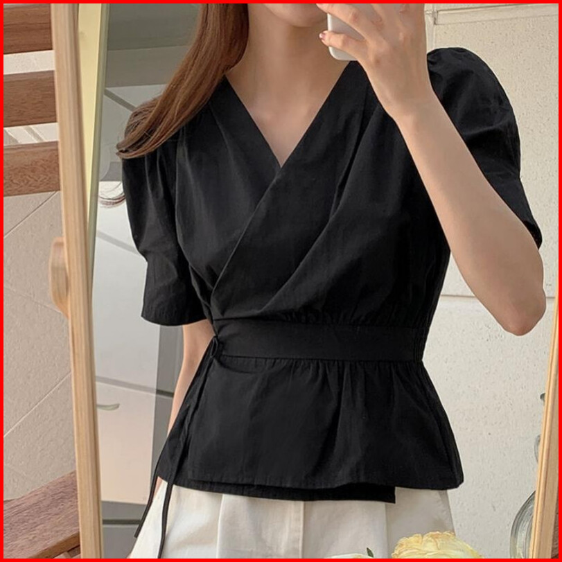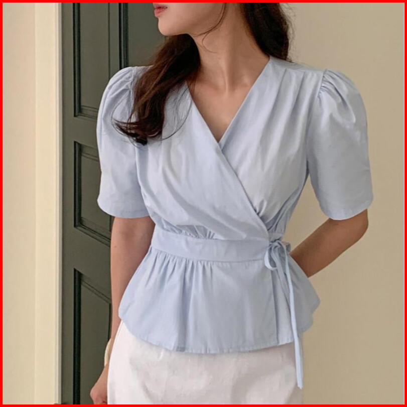 Blouse Wanita Korea French Elegan Kemeja Putih Lengan Pendek V-neck Slim Fit Atasan Crop Top Kekinian