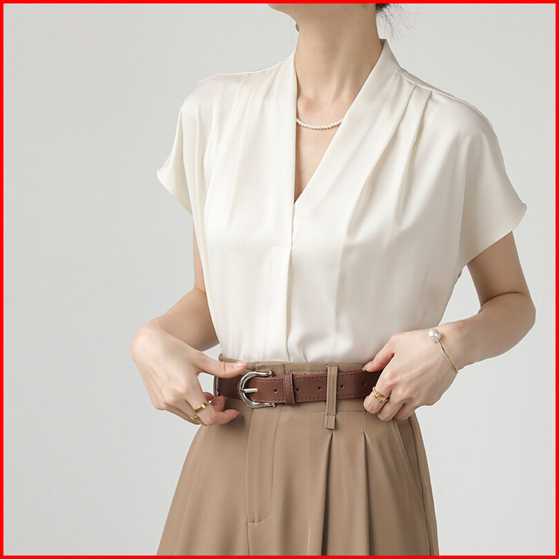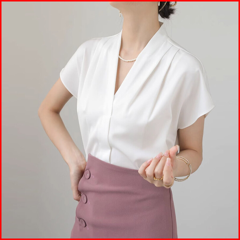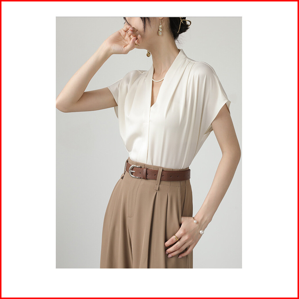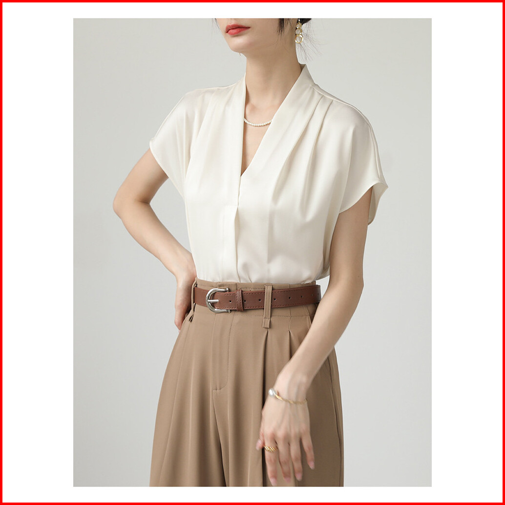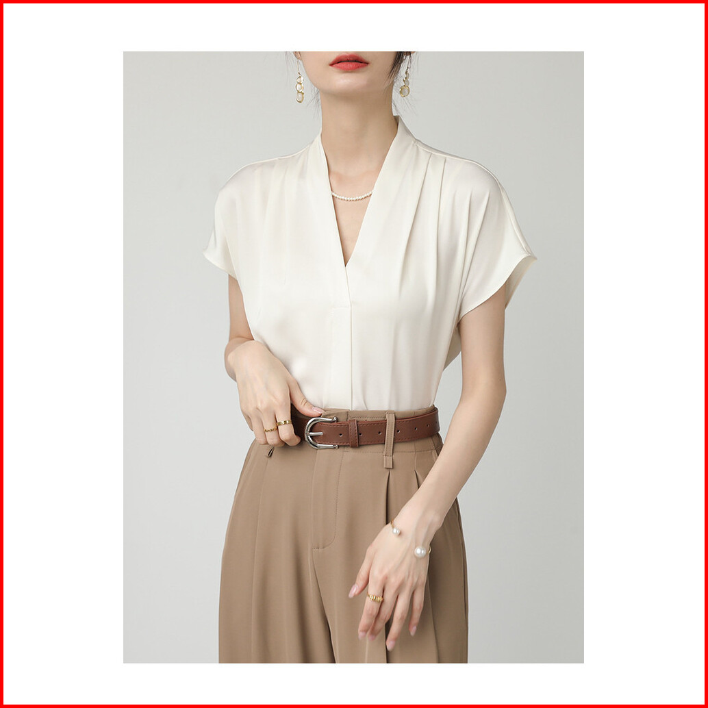 Blouse Wanita Korea Terbaru Kemeja Satin V-neck Lengan Pendek Elegan Polos Prancis Kemeja Kerja