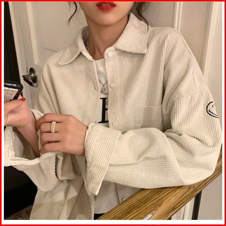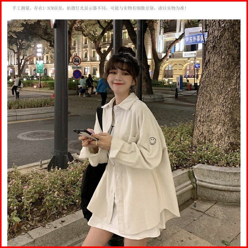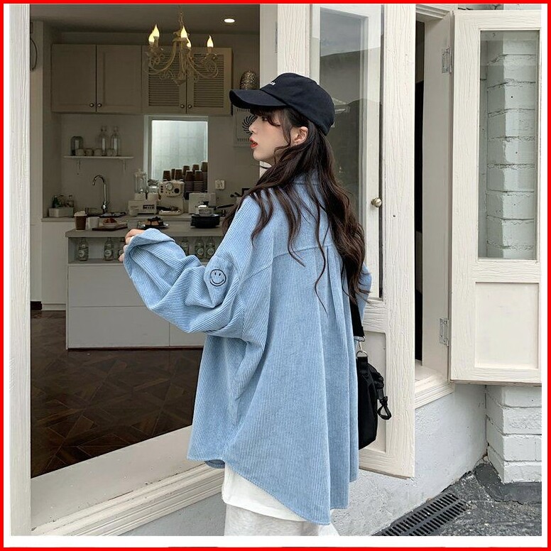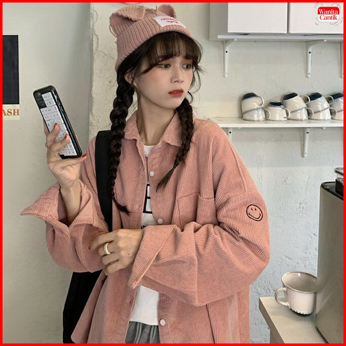 Blouse Kemeja Wanita Lengan Panjang Corduroy Korean Style Oversize Motif Bordir Smile Face Casual Atasan Blus