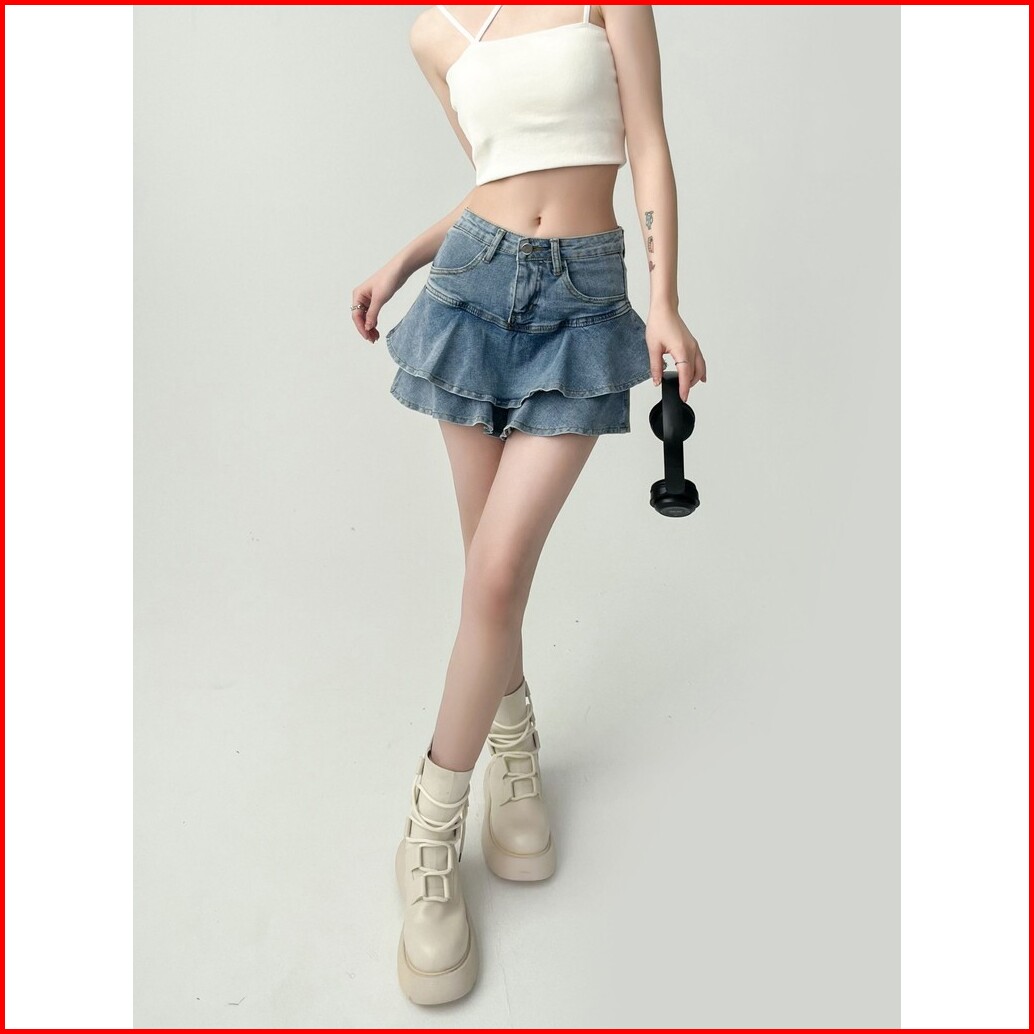 Rok Jeans Pendek Wanita High Waist Korean Style A-line Seksi Rok Duyung Rok Bertingkat Denim Terbaru