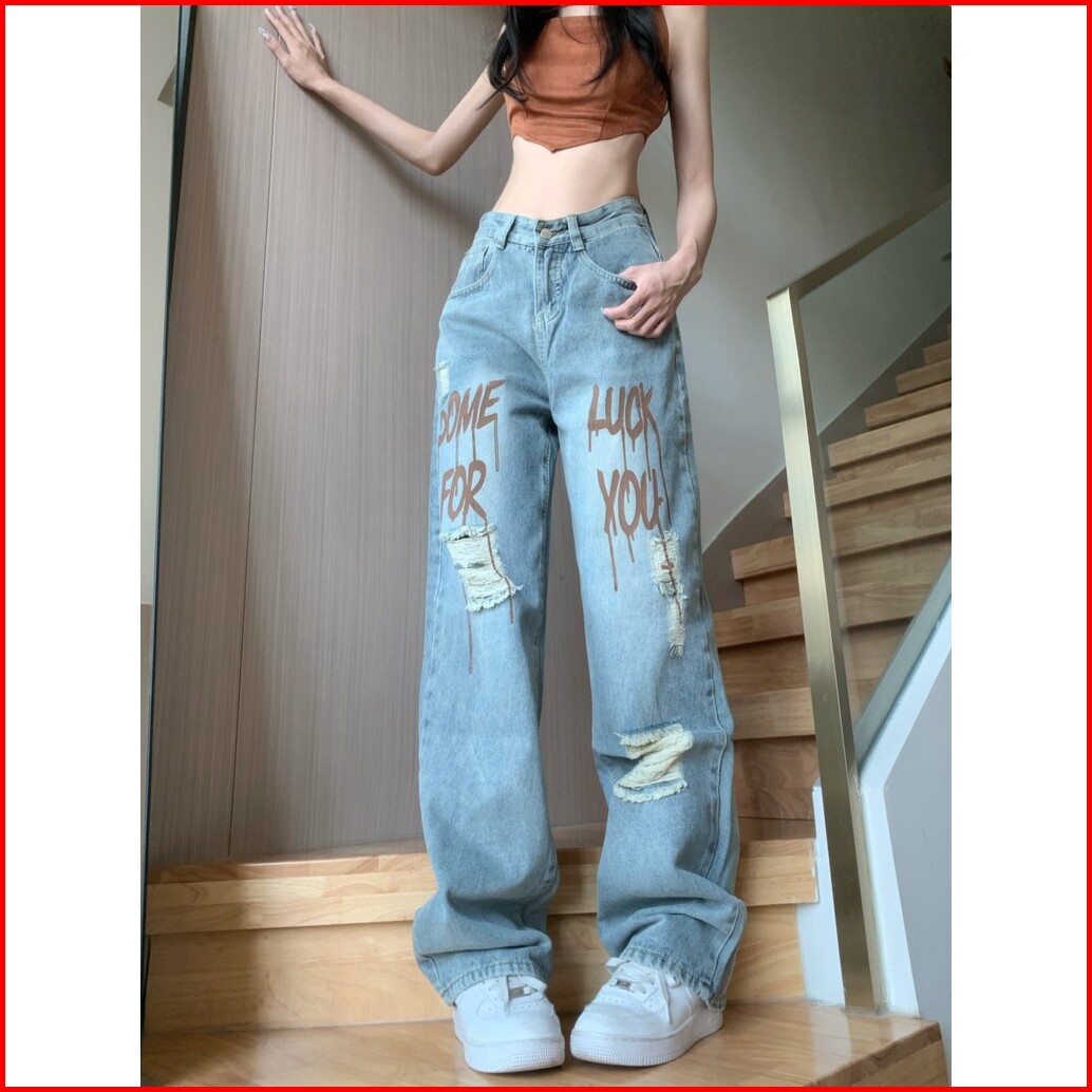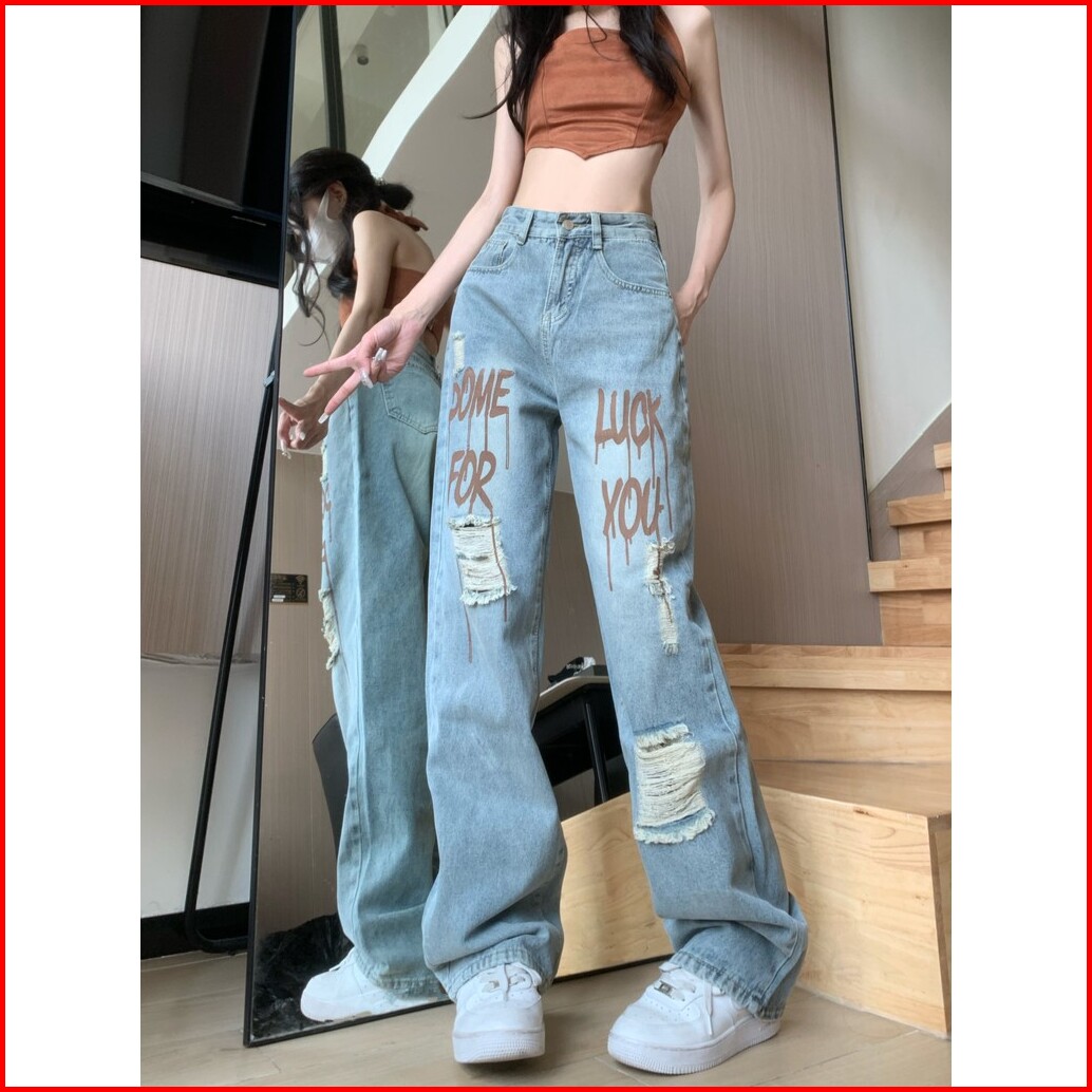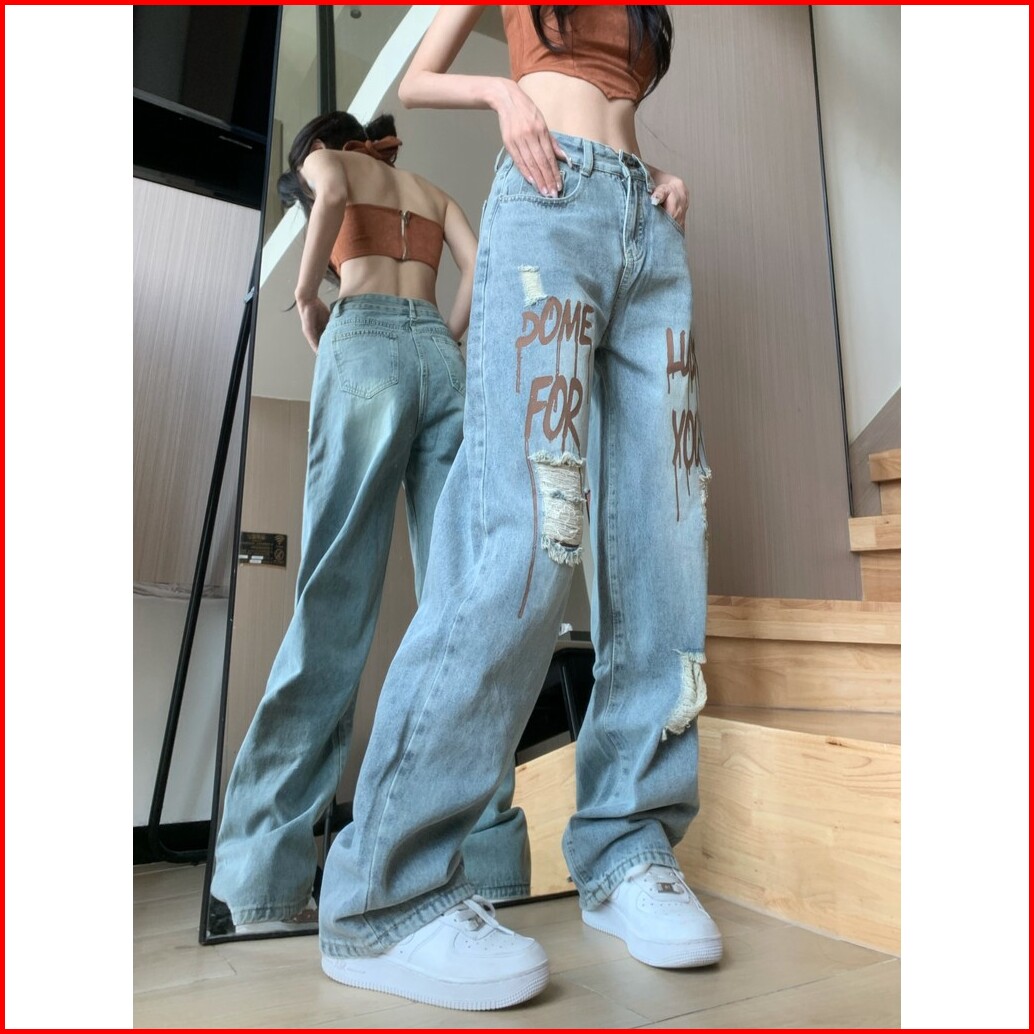 Celana Jeans Wanita Model Korea Motif Huruf Cetak Desain Robek Longgar Straight Leg Dan Gaya Kasual
