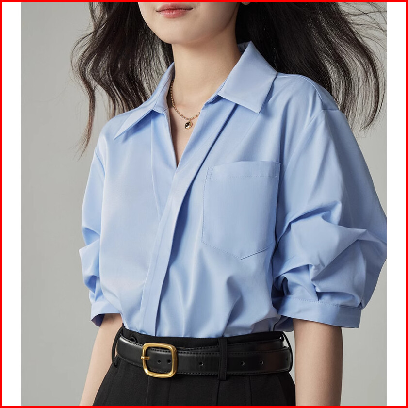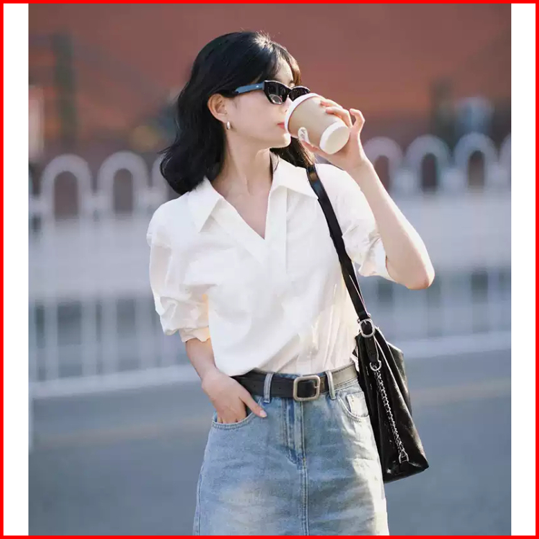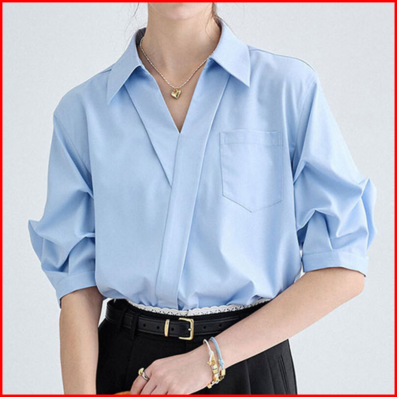Blouse Kemeja Wanita Lengan Pendek Korea Elegan Fashion Desain V-neck Warna Putih Lengan Sebahu