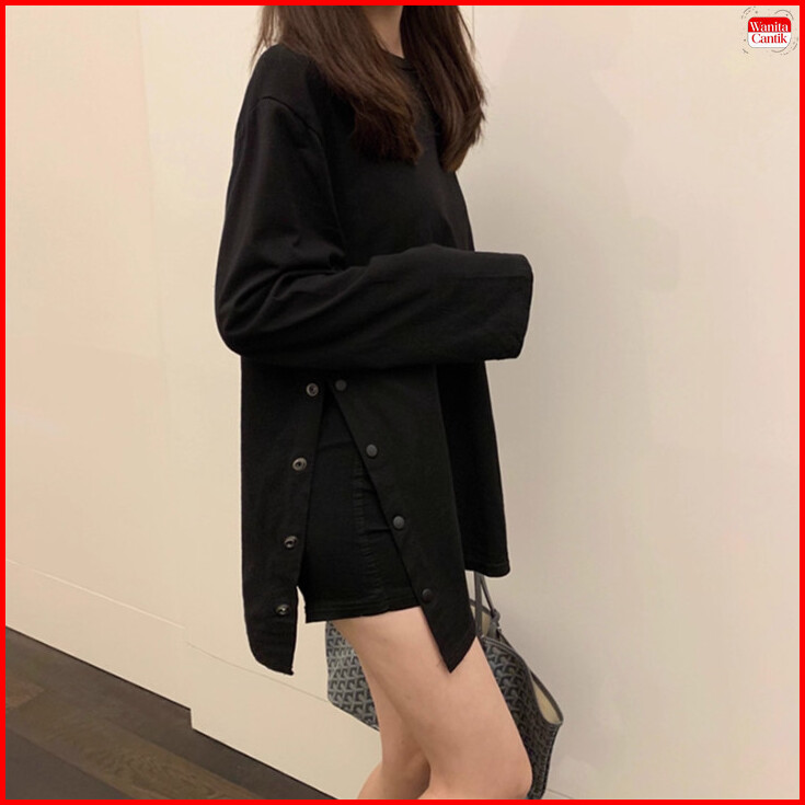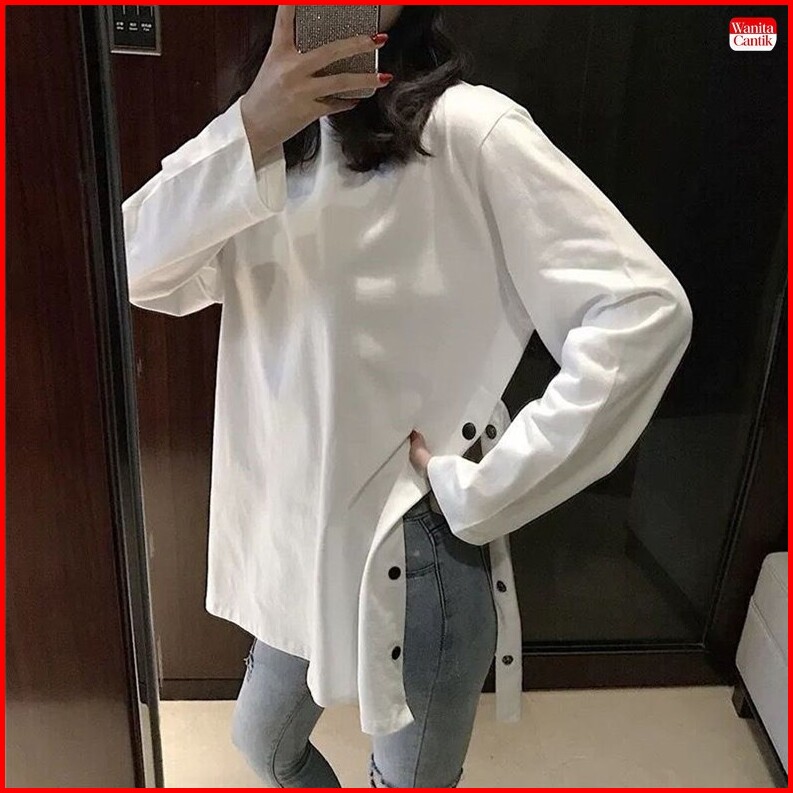 Kaos Lengan Panjang Wanita Korea Oversize Polos Putih Atasan Casual Belah Samping Basic T-shirt