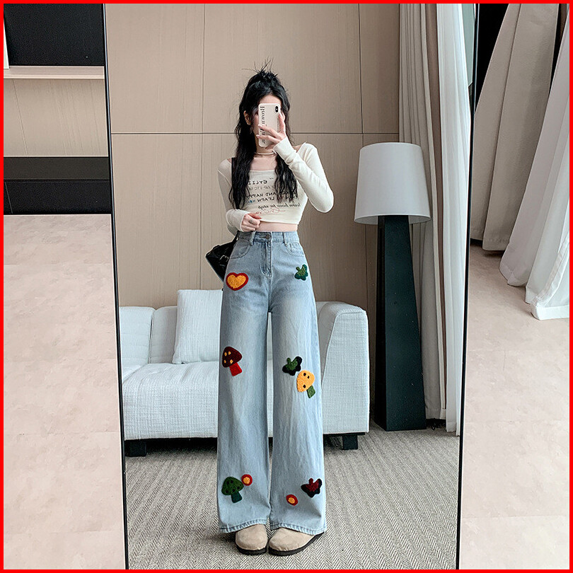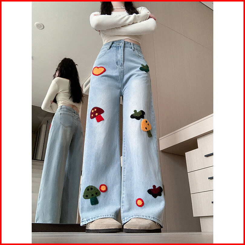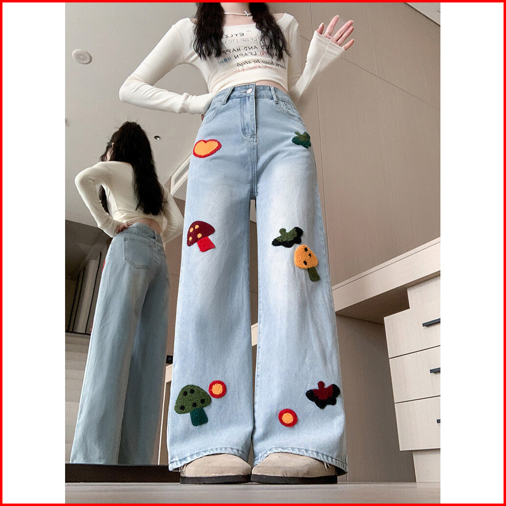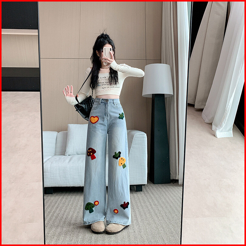 Celana Jeans Wanita Korea High Waist Baggy Wide Leg Bordir Lucu Fluffy Celana Panjang Palazzo Denim Lurus Trendy Oversiz