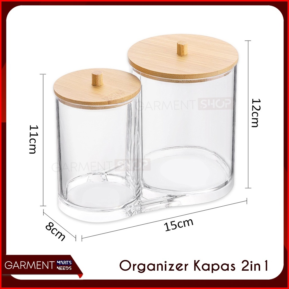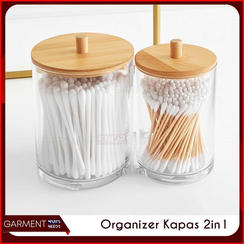 Toples Penyimpanan Kapas Cotton Bud 2in1 Bulat Acrylic Box Kosmetik Transparan Tutup Kayu