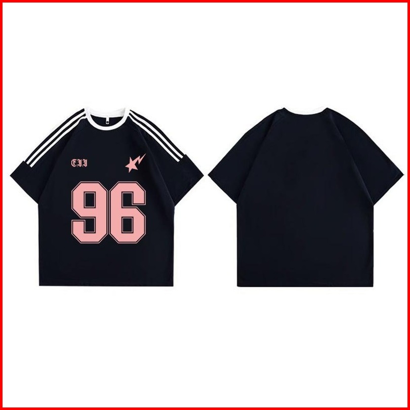 Forteid Cetakan Merek Trendi Retro Baju Oversize Bergaris Bahu Korean Style Kaos Bintang Petir Merah Muda No. 28 Baju Cl