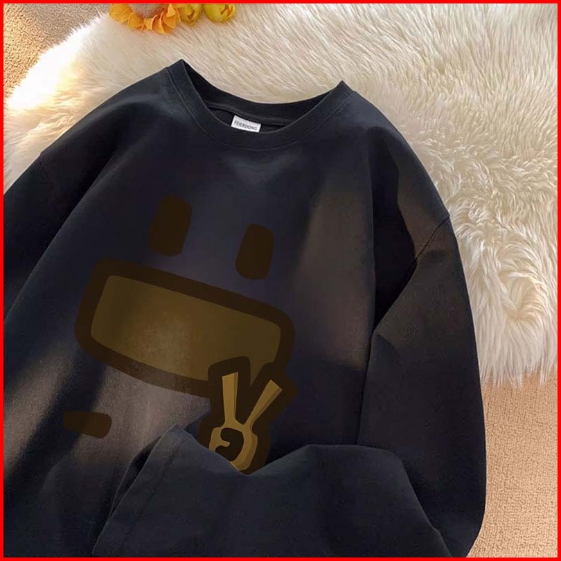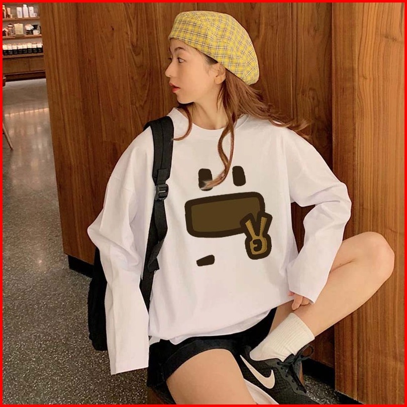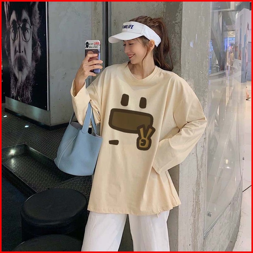 Forteid Atasan Kaos Wanita Oversize Lengan Panjang Korean Style Cetakan Wajah Tersenyum Yang Lucu Dan Menggemaskan Baju