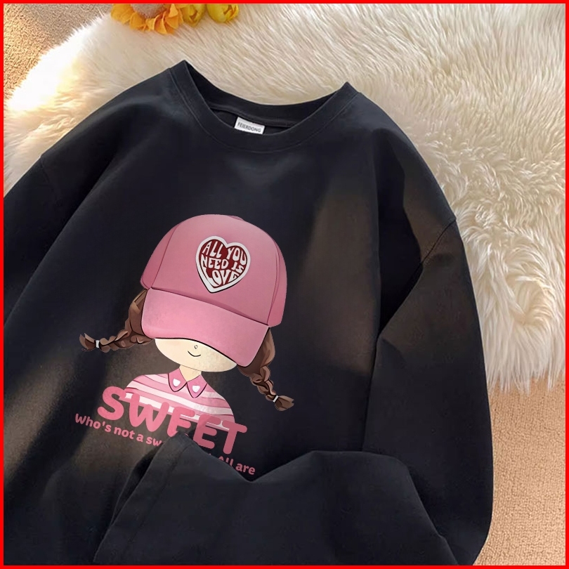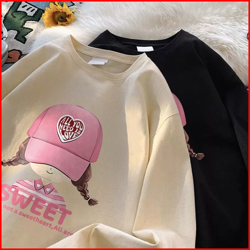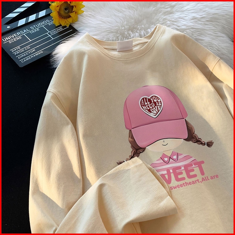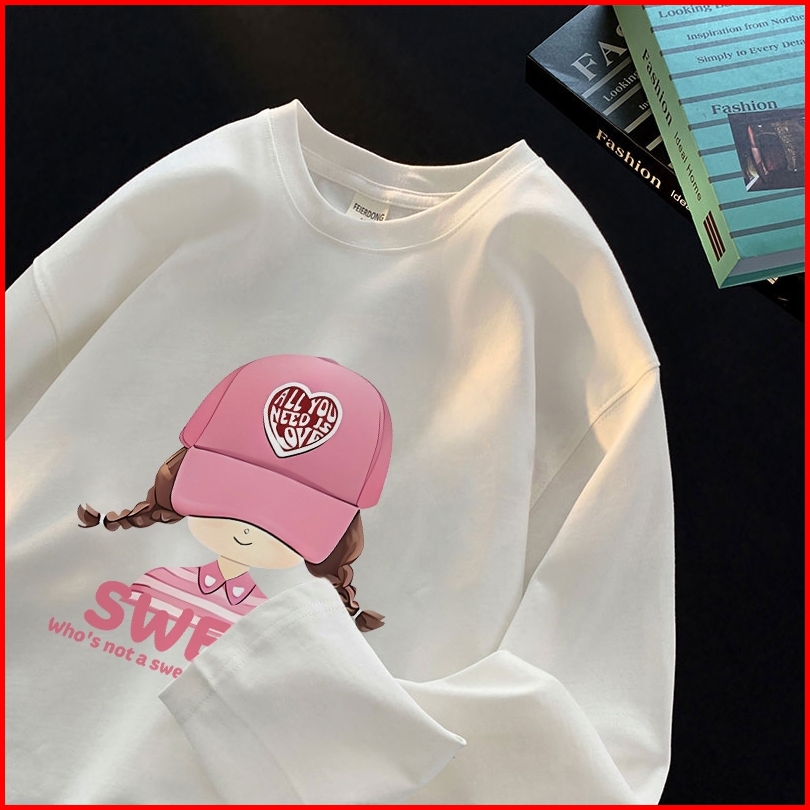 Forteid Atasan Kaos Wanita Oversize Lengan Panjang Korean Style Pola Cetak Gadis Topi Merah Muda Yang Lucu Baju Kaos Pol