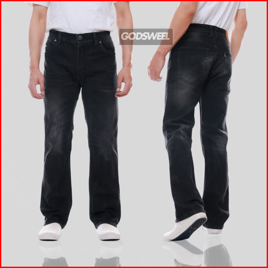 Godsweel Celana Jeans Pria Reguler Standar Panjang Stretch Meral Aksen Selvedge Blackwash Gombrong