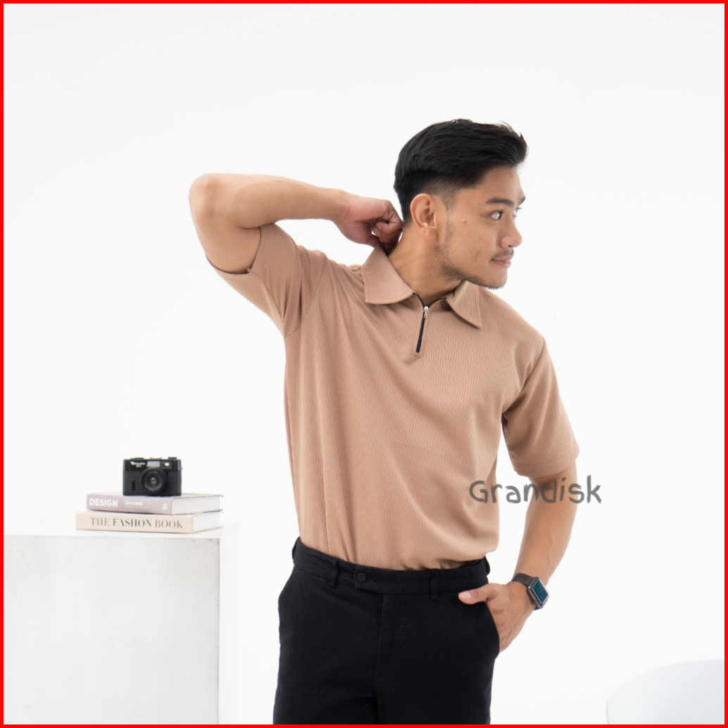 Polo Shirt Knit Motif Salur Kecil Zipper Half Zipp Pria Baju Korean Knit Kerah Resleting Garis Kecil Cutting Slim Fit Ta