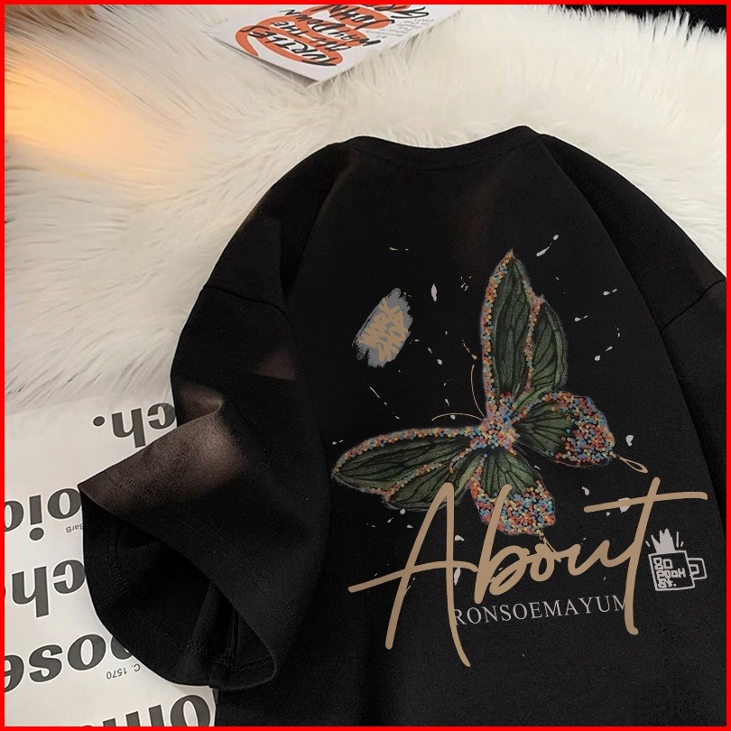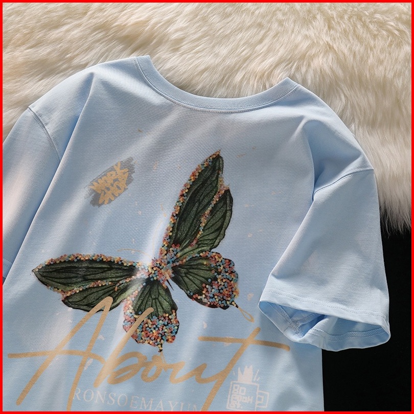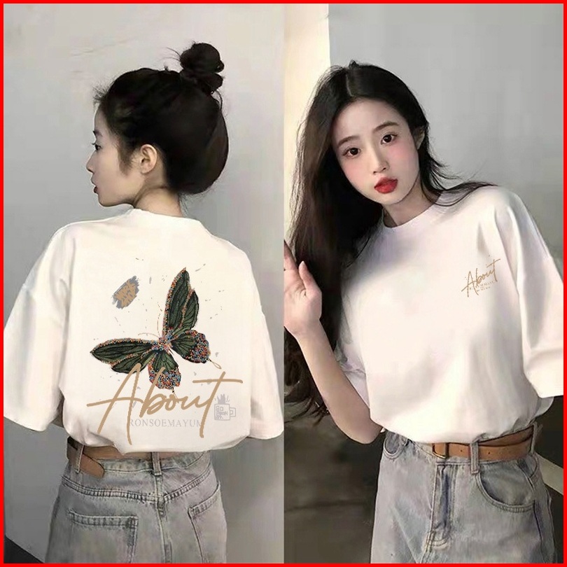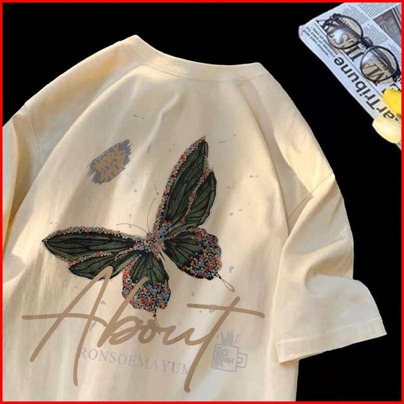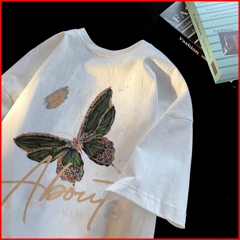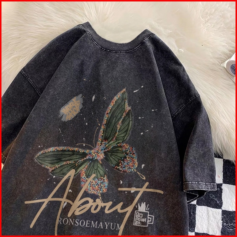 Forteid T-shirt Washed Oversize Cetakan Pola Kupu-kupu Dan Huruf Baju Atasan Lengan Pendek Wanita Kaos Oversize Terbaru