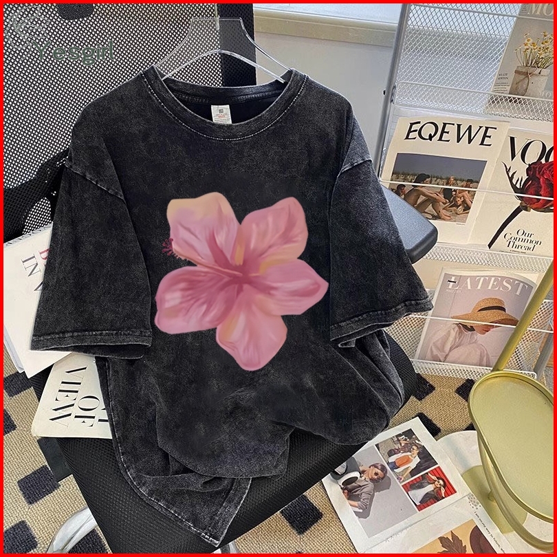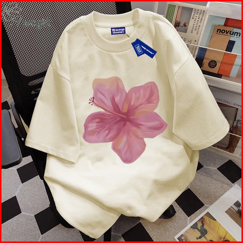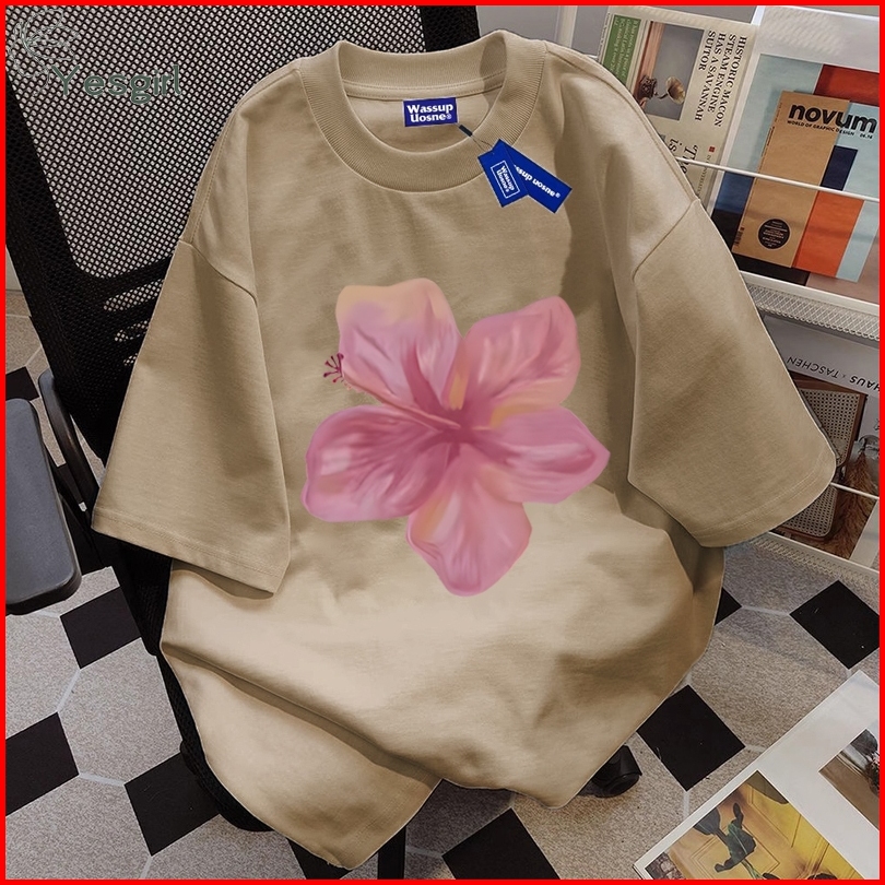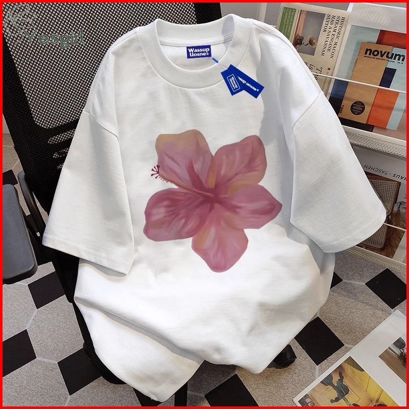 Yesgirl Korea Style Bunga Merah Print Kaos Kasual Longgar Kaos Oversize Wanita Fashion Korean Style Baju Kaos Oversize B