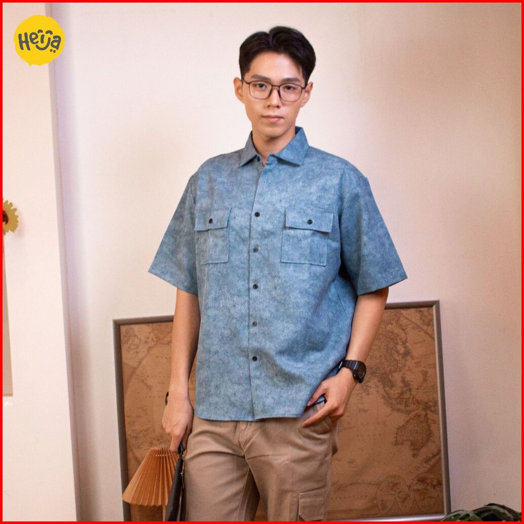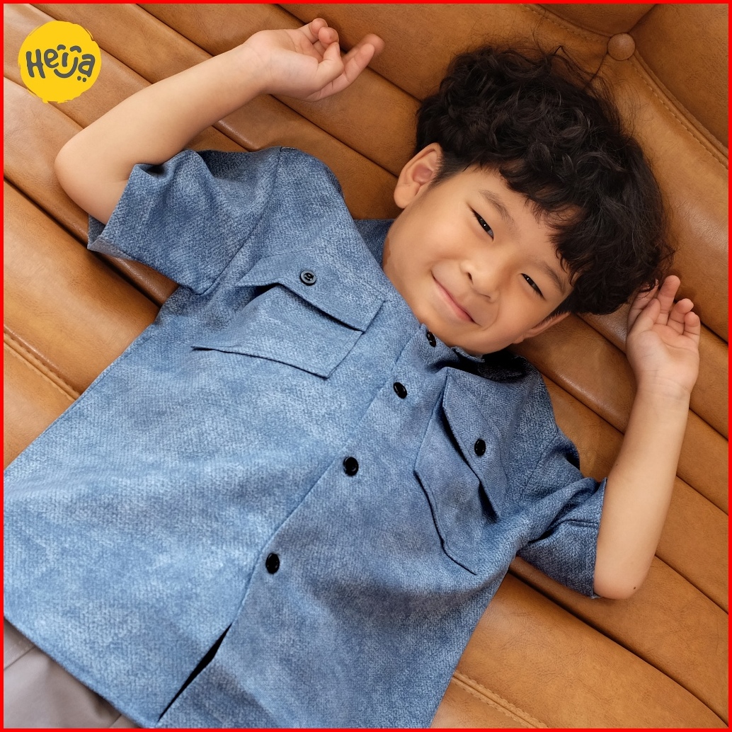 Heija Pocky Shirt Kemeja Jeans Anak Lengan Pendek Warna Denim Oversize Kantong Pocket Remaja Tanggung 1-14 Tahun Couple