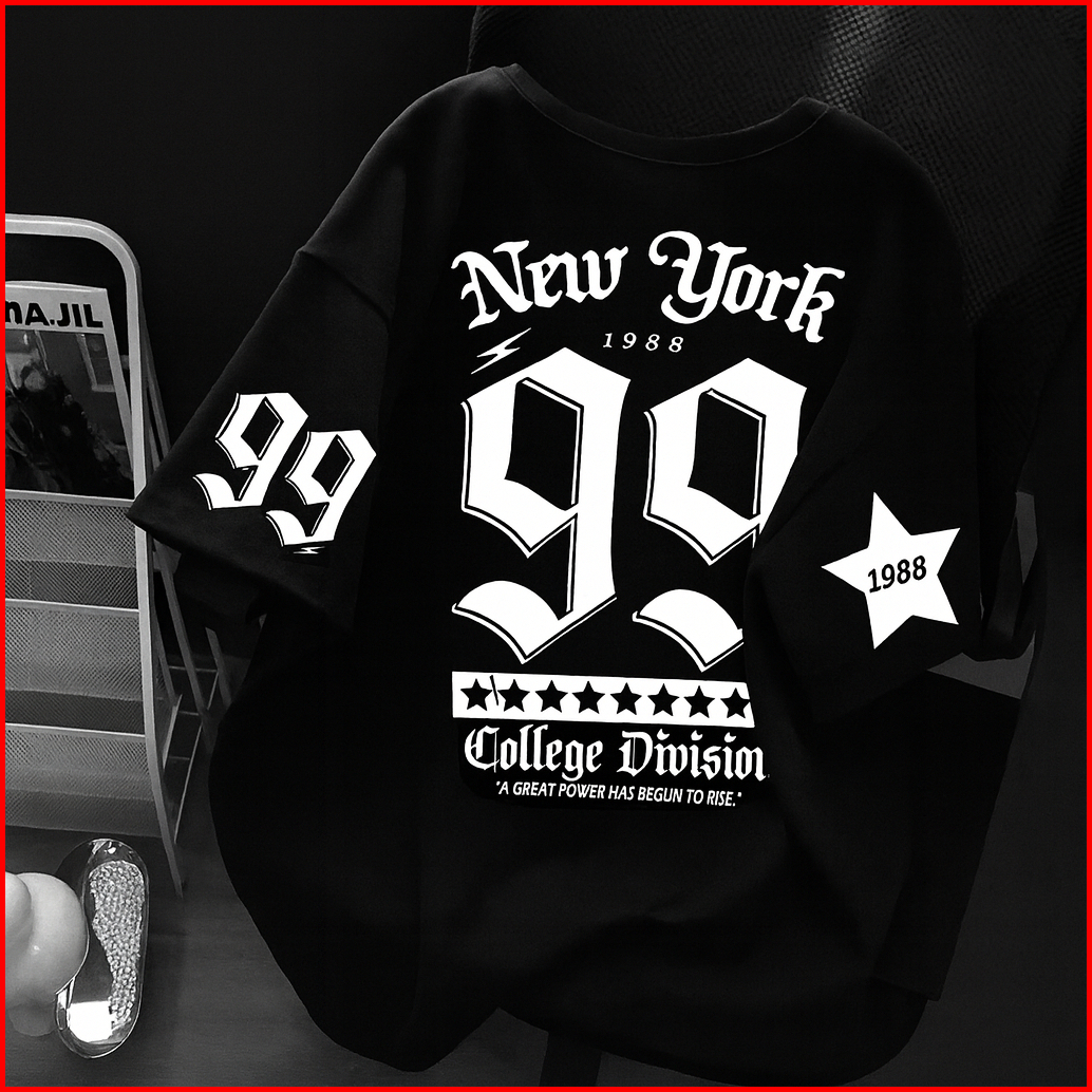 Wenz Kaos Distro Pria Wanita Oversize New York 99 College Division 1988 Streetwear Jersey Hitam Putih Cowok Cewek