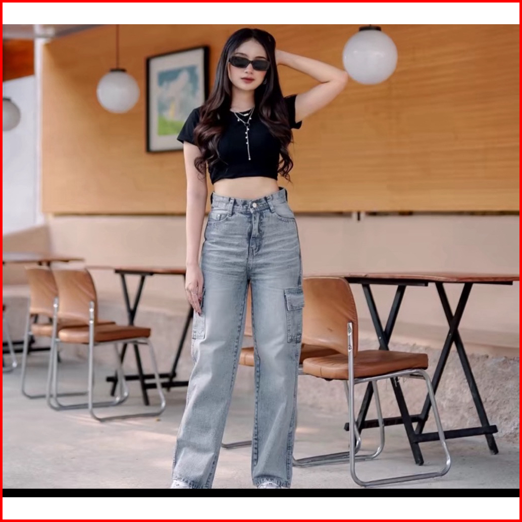 Cargo Jeans Highwaist Baggy Loose Wanita Celana Cargo Retro Whiskers Premium