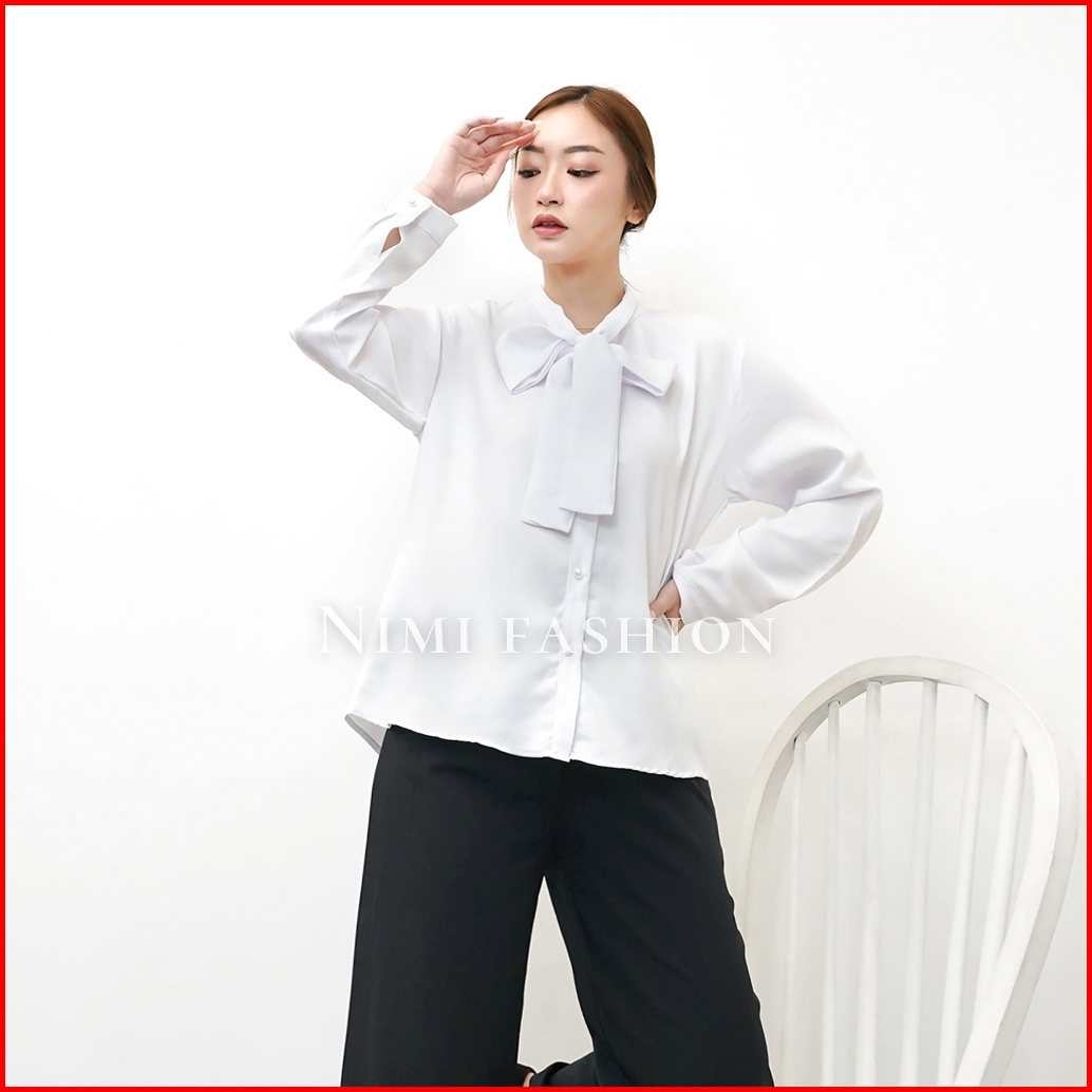 Nimi - Kemeja Putih Dasi Lengan Panjang Bahan Moscrape White Shirt Women