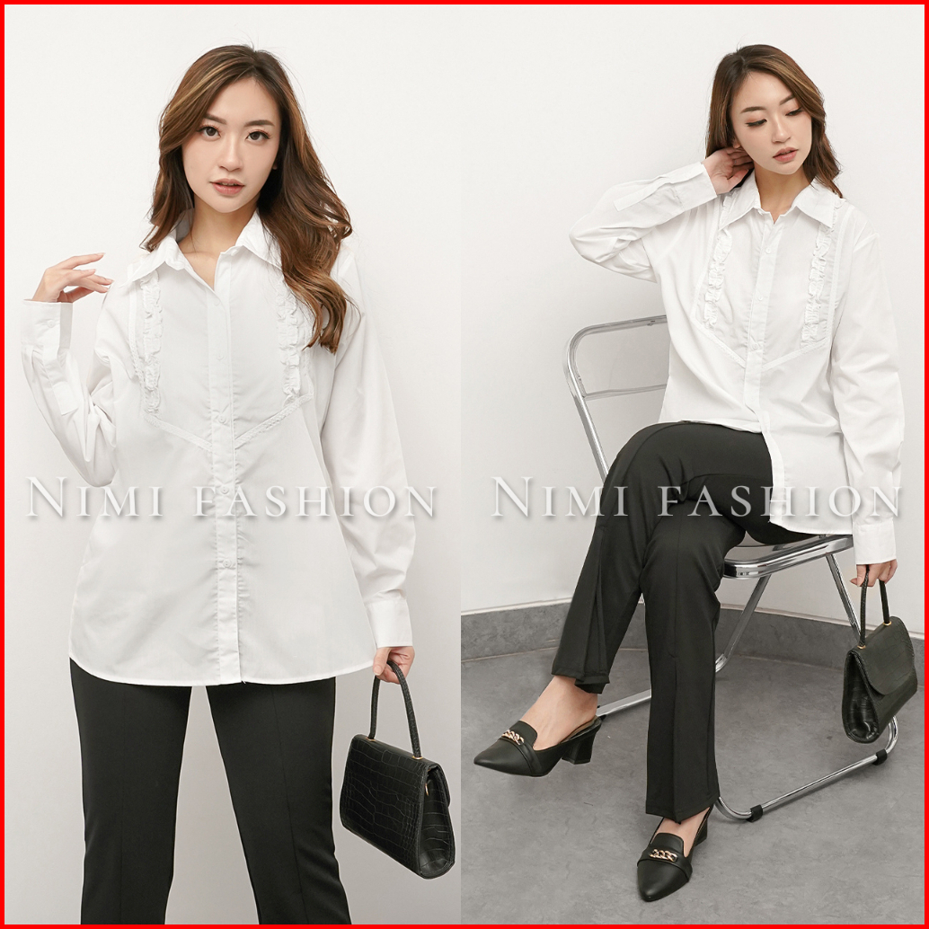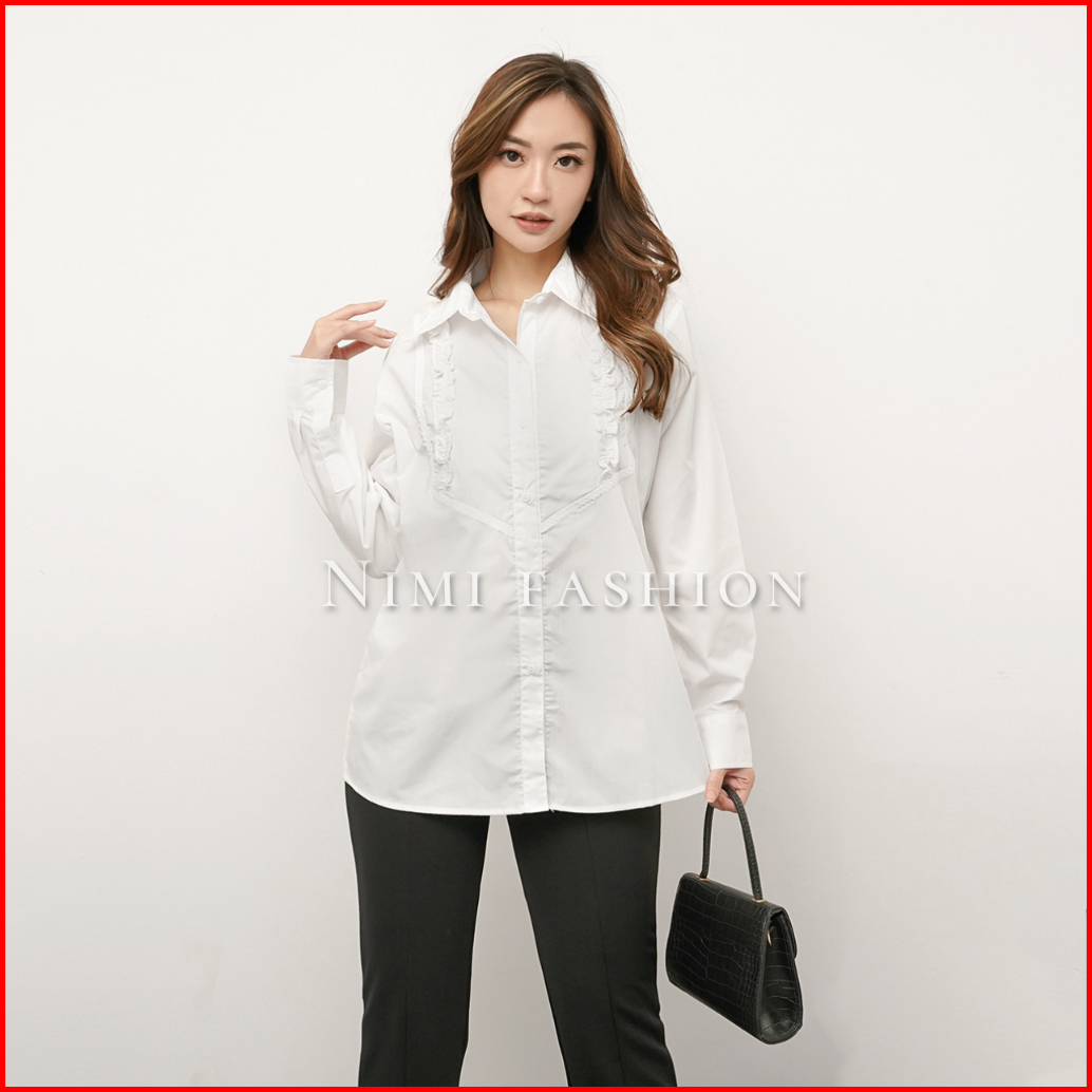 Nimi - Kemeja Putih Kantor Wanita Rempel Kombinasi Atasan Kemeja Putih Formal Lengan Panjang